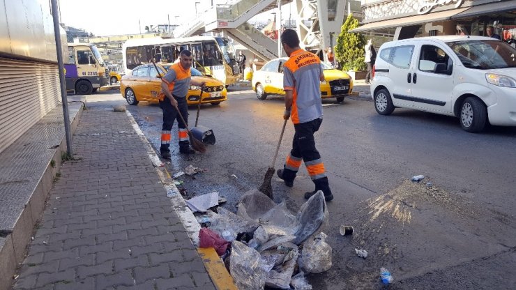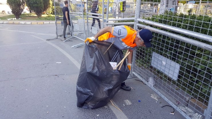Ellerindeki süpürgelerle alanı temizleyen görevliler, onca insan arasında biran önce işlerini bitirmek için çaba sarf etti.
