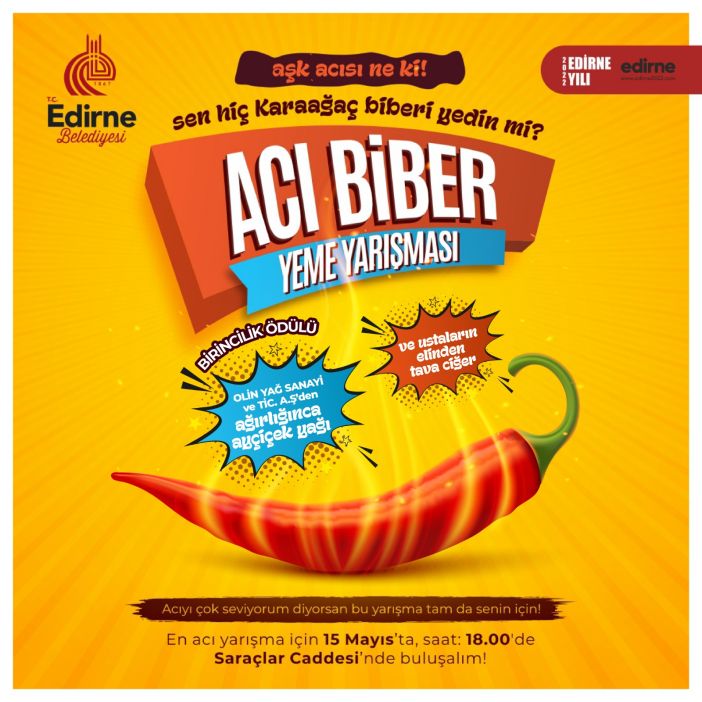 Edirne Belediyesi, Türkiye’nin en lezzetli, en eğlenceli festivallerinden biri olan 10. Uluslararası Edirne Bando ve Ciğer Festivali kapsamında düzenlenecek, “Acı Biber Yeme Yarışması”nın kazananına bu yıl ağırlığınca Ayçiçek yağını ödül olarak verme kararı aldı. Edirne Belediye Başkanı Recep Gürkan, her yıl yarışma birincisinin altınla ödüllendirildiğini, ancak bu yıl aile bütçesine katkı amacıyla ödülü Ayçiçek yağı olarak belirlediklerini belirterek, “Malum Ayçiçek yağı fiyatları çok arttı. Biz de bu senenin en çok acı biber yiyen yarışmacısını kendi ağırlığınca Ayçiçek yağı ile ödüllendireceğiz” dedi.