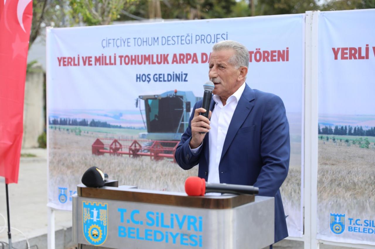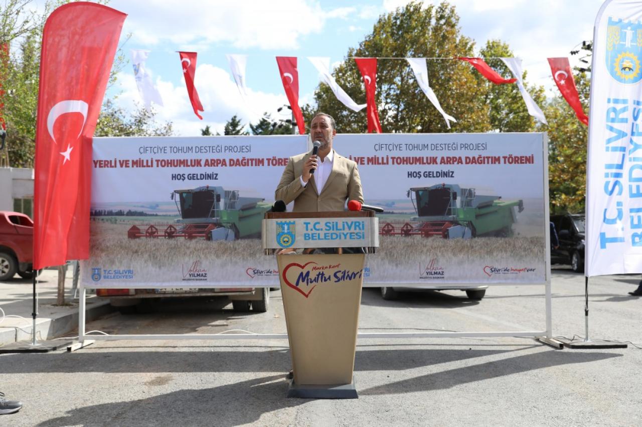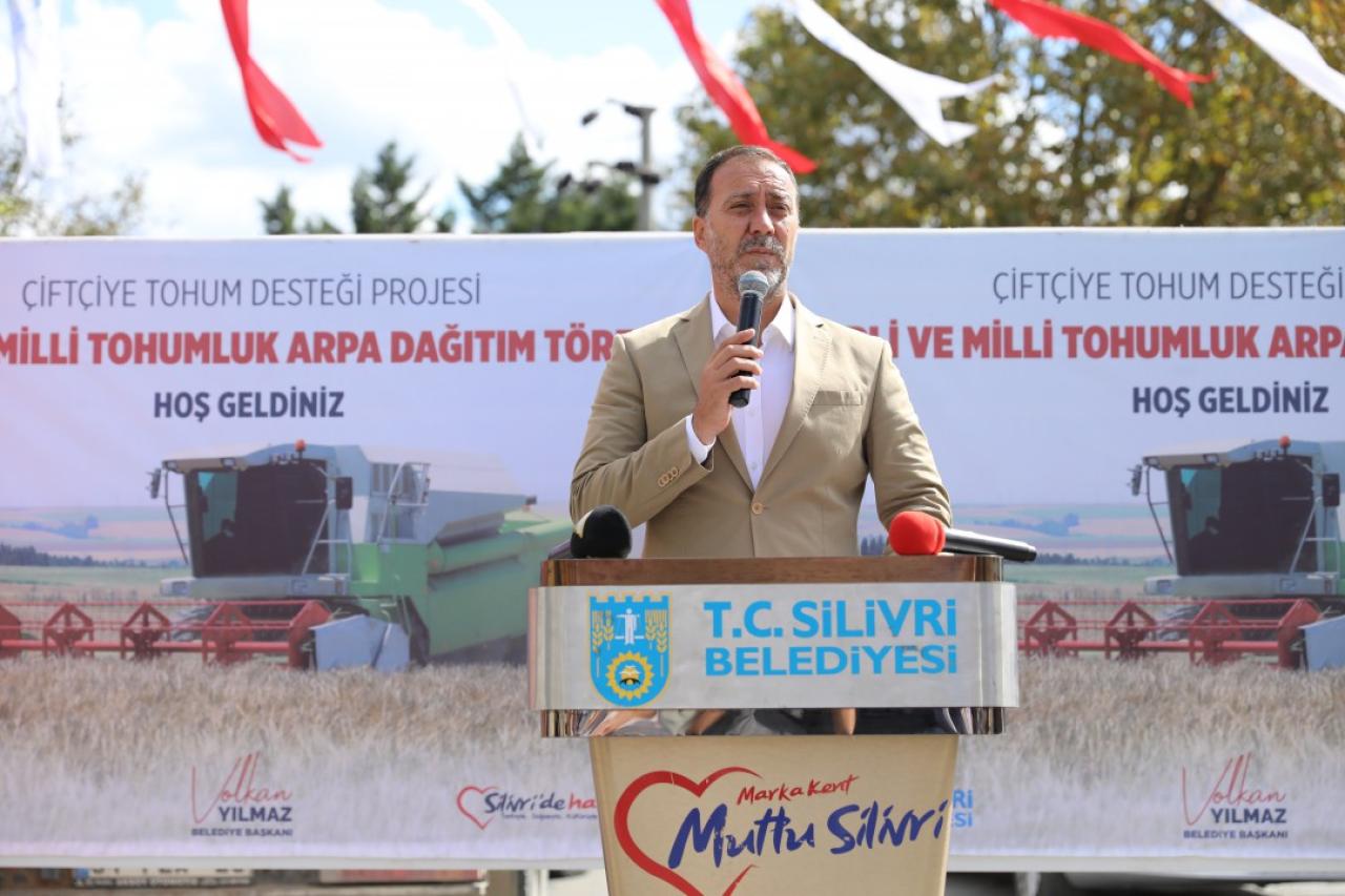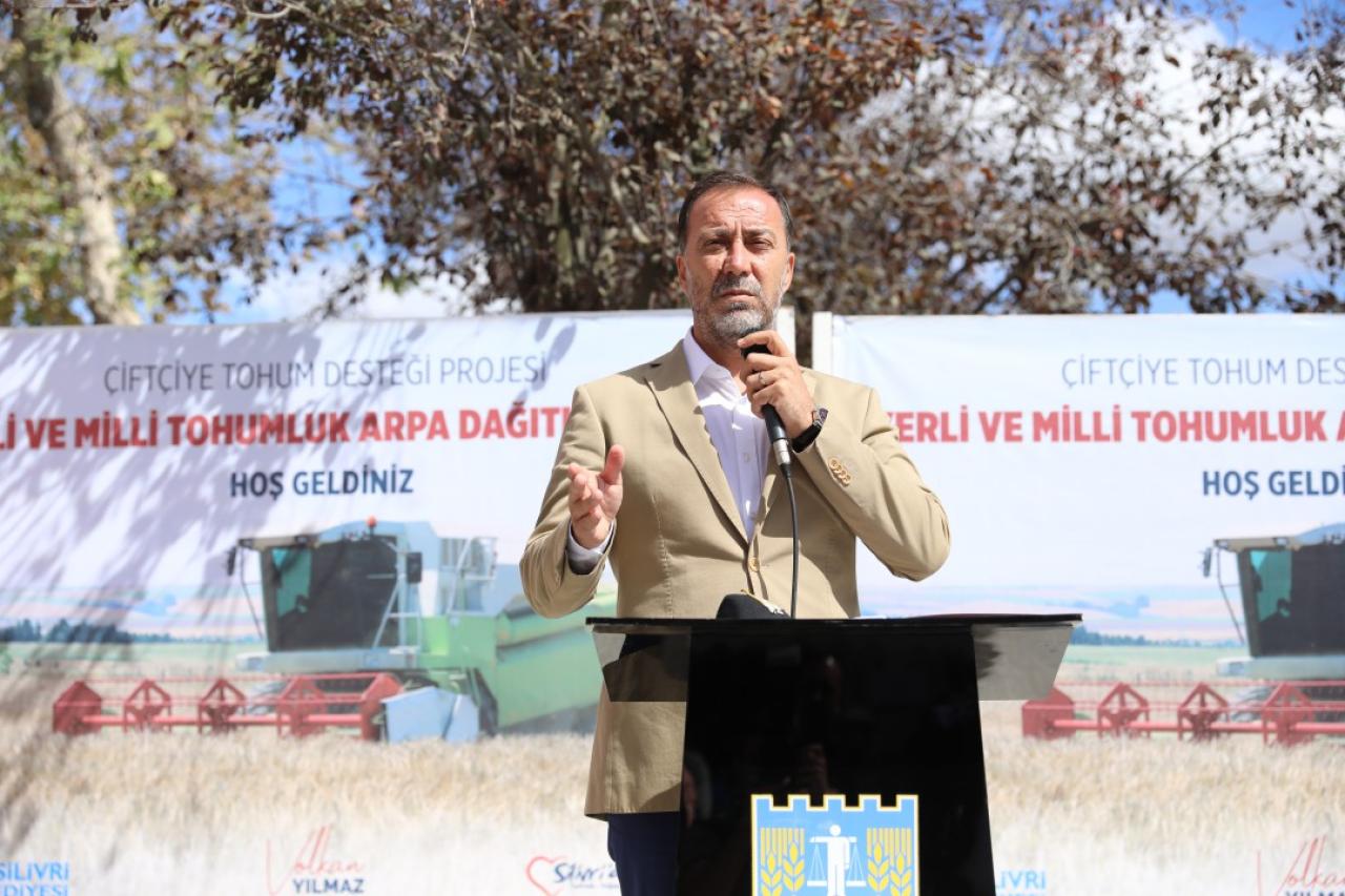 Silivri Belediyesinin tarımsal faaliyetleri hakkında bilgiler veren Başkan Yılmaz, “Göreve geldiğimiz ilk yıl 300 dönüm ile başladığımız tarımsal faaliyetlerimizde bugün 3 bin 600 dönüme ulaşmış durumdayız. Silivri Belediyesi çalışmalarıyla Türkiye’de öncü ve örnek oldu. İstanbul Büyükşehir Belediyesi (İBB) ve Ankara Büyükşehir Belediyesi bizim yaptıklarımızın aynısını yaparak çiftçiye destek oluyorlar. Bundan dolayı çok mutluyuz. Hem yaptığımız işin doğruluğu tescillenmiş oluyor hem de çiftçilerimiz desteklenmiş oluyor. Bu yıl 800 ton tohumluk arpanın hasadını yaptık. Bunun 300-350 tonunu Silivri’deki çiftçilerimizde 200’er kiloluk dilimlerle paylaşıyoruz. Bu desteğin ekonomik değeri 6-7 milyon TL civarında. Paylaşımımızın sonunda 20-25 bin dönüm arazi yerli ve milli tohumlarla ekilecek. Üstelik bu tohumluk arpaları systiva ile ilaçladık. Bu sayede üreticilerimizi kök boğaz ilacı masrafından da kurtarmış olduk. Bu yıl 100 bin balya yem bezelyesi ve samanı çiftçilerimizle ücretsiz olarak paylaştık. 500 ton mısır silajı dağıtacağız. Geçtiğimiz yıl 50 bin litre ayçiçek yağını 5’er kiloluk dilimlerle 10 bin ailemize hediye ettik. Bu yıl Trakya Kalkınma Ajansı, Trakya Tohumcular Birliği, Namık Kemal Üniversitesi, İstanbul Teknik Üniversitesi ve Silivri Belediyesi ortaklığıyla yerli ve milli ayçiçek ekimi yaptık. Oradan aldığımız ürünlerle Silivri’nin farklı noktalarında 1.200 dönüme yerli ve milli ayçiçek tohumlarını ektik. Yani İsrail tohumu değil Türk tohumu ektik. Şu an hasat ediyoruz. Buradan elde edeceğimiz 100 bin litre ayçiçek yağını yine 5’er kiloluk dilimlerle 20 bin aileye ulaştıracağız. İlçe Tarım Müdürlüğümüz ile yaptığımız protokol çerçevesinde bütün hayvanların aşı ücretlerini biz ödüyoruz. Silivri Belediyesi olarak bir katı gübre serpme makinesi satın aldık. Çiftçilerimiz bizi aradığında kepçemizle, kamyonumuzla gidip ahırlarından gübrelerini alıyoruz. Eğer tarlalarına taban gübresi olarak kullanmak istiyorlarsa da serpme makinemizle mercimek tanesi kadar parçaladığımız gübreleri eşit miktarda, homojen bir şekilde tarlalarına dağıtıyoruz. Bununla ilgili çiftçilerimizden tek kuruş ücret almıyoruz. Kadir Has Üniversitesi ile hayata geçireceğimiz teknopark projesinin içerisinde bir de tarım teknoparkı olacak. Tarımdaki teknolojik gelişmeleri sizlerle paylaşacağız. Cumhuriyetin 100. yıl dönümünü kutlayacağımız 2023 yılında, 2023 paket yerli ve milli ayçiçek tohumunu üreticilerimizle paylaşacağız. Çiftçilerimiz 1 paket tohumla 25 dönüm yer ekebilecek. Yani Silivri Belediyesinin dağıttığı tohumlarla yaklaşık 50 bin dönüm arazi yerli ve milli Türk tohumu ile buluşacak.” diye konuştu.