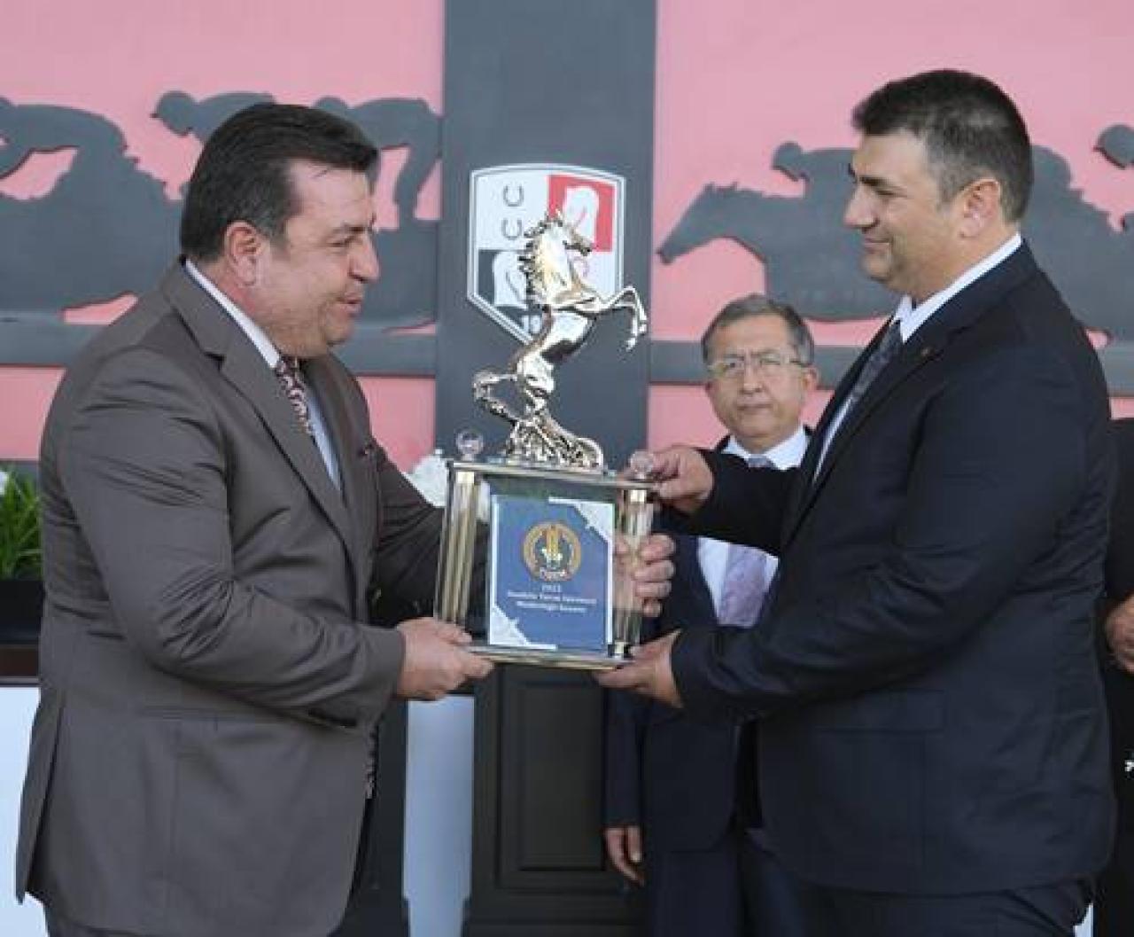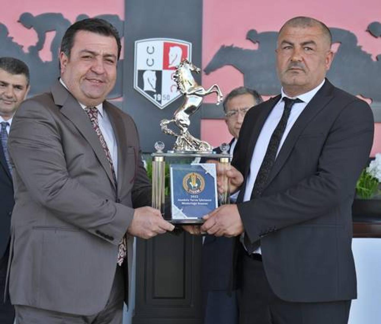TİGEM Genel Müdürü Müdürü Dr. Hasan Gezginç ayrıca kazanan safkanın yetiştirildiği işletme adına TİGEM Atçılık Daire Başkanı Dr. Murat Durmaz'a kristal şilt takdim etti.