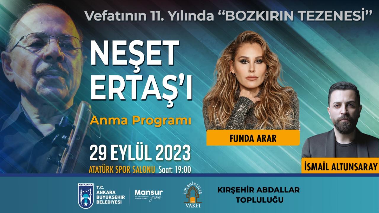 Ankara Büyükşehir Belediyesi Kültür ve Sosyal İşler Daire Başkanlığı ile Kırşehirliler Vakfı tarafından ortaklaşa düzenlenecek olan anma programında“Bozkırın Tezenesi”olarak da bilinen kendine has üslubu ile halkın gönlünde taht kuran büyük halk ozanı Neşet Ertaş’ın sevilen türkülerini ünlü sanatçılar seslendirecek.