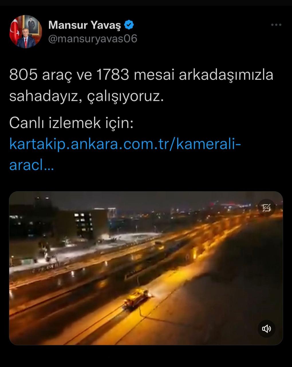 Ekipler kar yağışının olumsuz etkilerine karşı 7/24 esasına dayalı olarak mesai yaparken ABB Başkanı Mansur Yavaş karla mücadele çalışmaları hakkında sosyal medya hesaplarından, “805 araç ve 1783 mesai arkadaşımızla sahadayız, çalışıyoruz. Canlı izlemek için:kartakip.ankara.com.tr” notunu paylaştı.