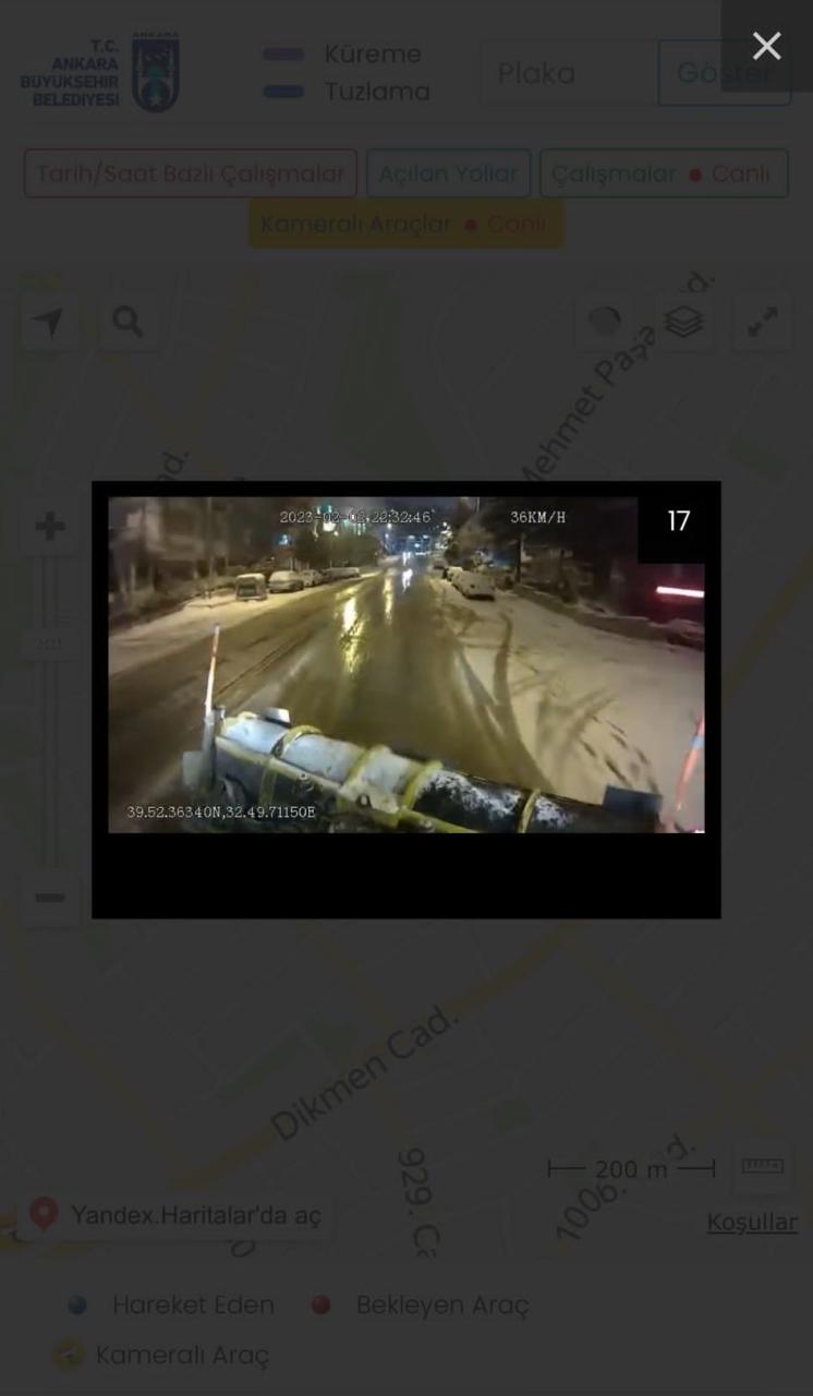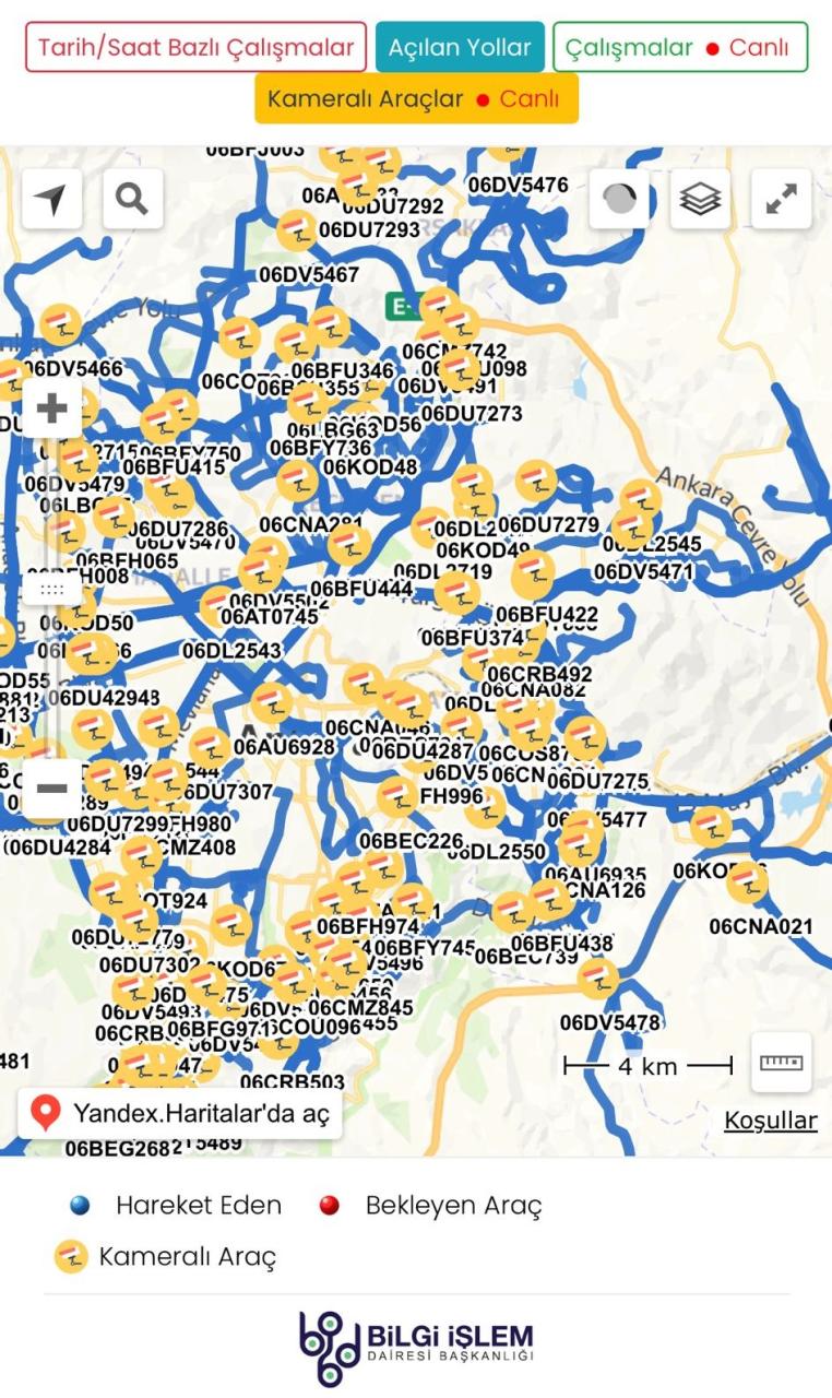 Türkiye’de ilk kez Ankara Büyükşehir Belediye Başkanı Mansur Yavaş’ın hayata geçirdiği proje kapsamında “kartakip.ankara.com.tr” adresi üzerinden vatandaşlar karla mücadele çalışmalarını canlı olarak takip edebiliyorken, araçların konumuna, çalışma güzergâhlarına ve plaka bilgilerine de anlık ulaşabiliyor. Böylece evine, işine ya da başka bir yere araçlarıyla gidecek olan Başkentliler caddelerin durumu hakkında bilgi edinebiliyor.