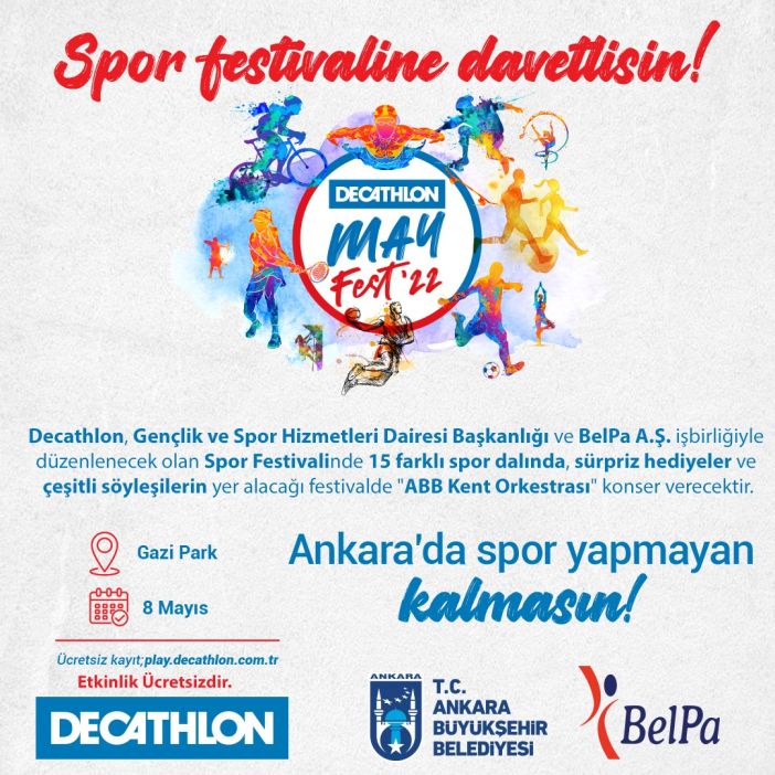 Ankara Büyükşehir Belediyesi, Başkentlilerin spora olan ilgisini artırmak ve Ankara’yı sporun da başkenti yapmak amacıyla çeşitli spor etkinliklerine ev sahipliği yapıyor. ABB Gençlik ve Spor Hizmetleri Daire Başkanlığı, Kültür ve Sosyal İşler Daire Başkanlığı, BelPa ve Decathlon iş birliği ile 8 Mayıs 2022 Pazar günü Gazi Park’ta düzenlenecek olan “May Fest’22”, sporseverler ile profesyonel sporcuları bir araya getirecek. Birbirinden renkli yarışmaların yer alacağı spor festivalinde, ASKİ Spor ve FOMGET Gençlik ve Spor Kulübü sporcuları da katılımcıların sorularını yanıtlayacak.