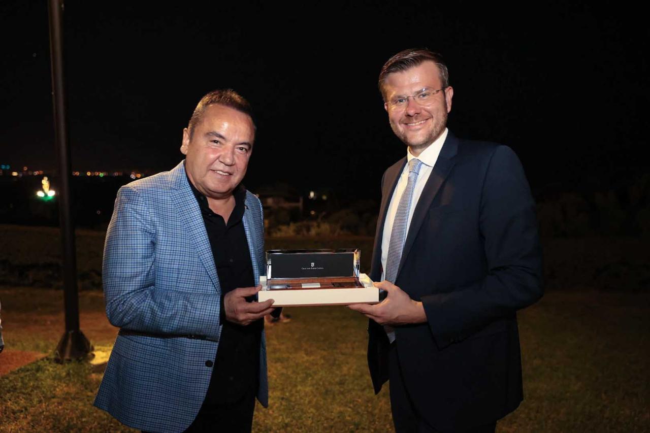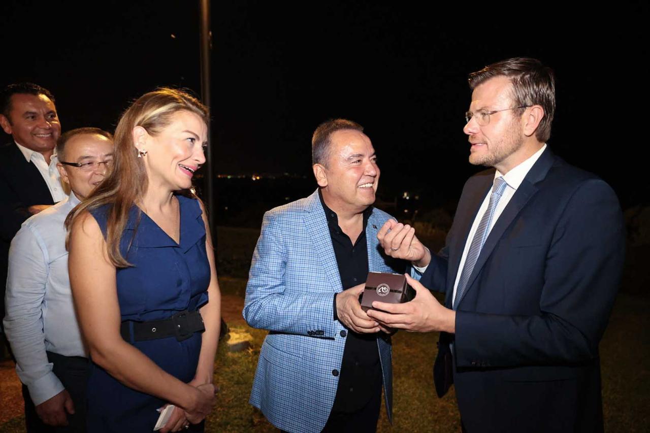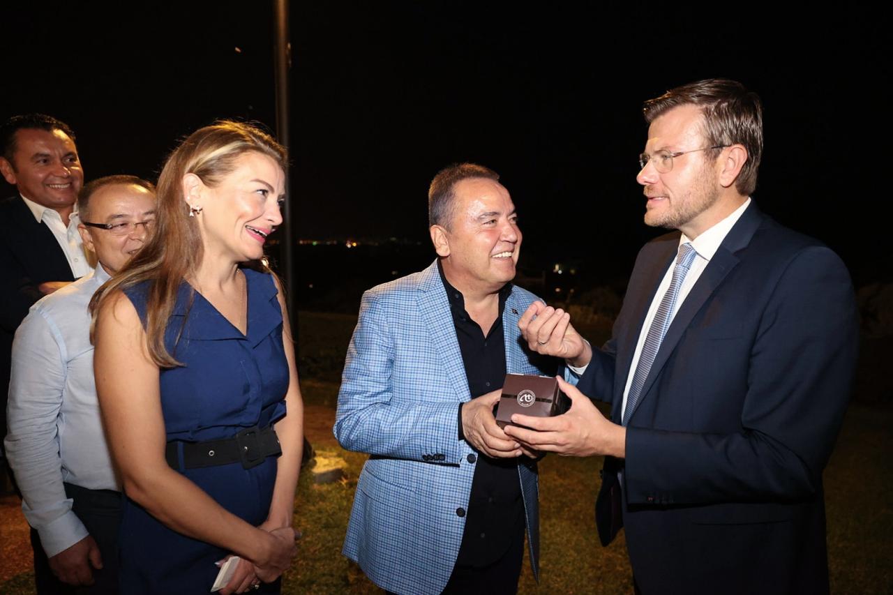 Antalya Büyükşehir Belediye Başkanı Muhittin Böcek, Nürnberg Belediye Başkanı Marcus König ve konuk heyet onuruna akşam yemeği verdi. Konuk heyeti Antalya’da ağırlamaktan duyduğu memnuniyeti dile getiren Başkan Muhittin Böcek “Hoş geldiniz. Antalya-Nürnberg kardeşliğinin 25. yılı kutlu olsun. Çeyrek asırlık dostluğun, kardeşliğin daha uzun yıllar sürmesini diliyorum. Antalya ve Nürnberg bu süreçte kültürel, eğitim ve sosyal alanda önemli ilişkiler kurdu. Antalya ve Nürnberg için yeşil alanları artırmamız gerek. Bu bağlamda bugün ağaç dikimi yaptık. Çocuklarımıza sürdürülebilir bir dünya bırakmak için bu alanlarda çalışmalar yapmamız gerekiyor” dedi.
