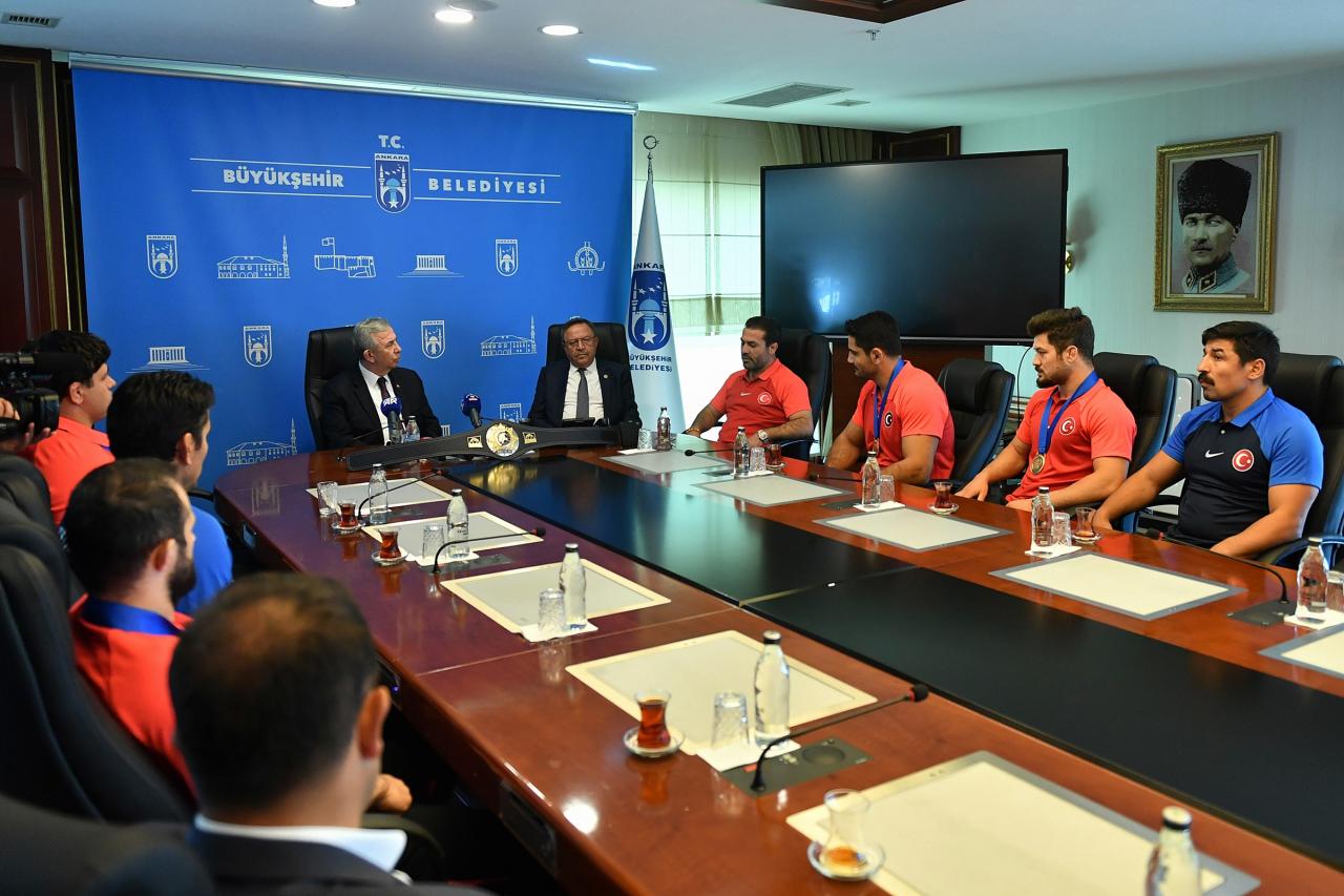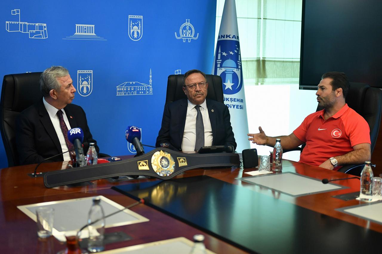 Sırbistan’ın başkenti Belgrad’da düzenlenen 2023 Dünya Güreş Şampiyonası'ndan 4 madalya ve 5 olimpiyat kotası alarak dönen milli güreşçiler Rıza Kayaalp, Taha Akgül, Ali Cengiz ve Enes Başar, Ankara Büyükşehir Belediye Başkanı Mansur Yavaş'ı makamında ziyaret etti.