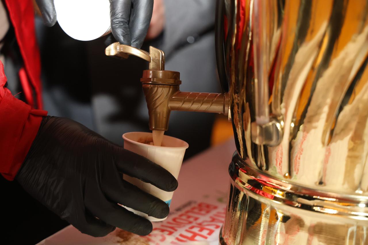 Camilerin avlularında kurulan stantlarda, belediye ekipleri tarafından üzerine tarçın eklenerek sıcak salep dağıtımı yapılıyor.