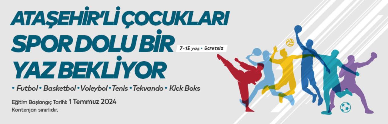 Futbol, basketbol, voleybol, tenis, tekvando ve kick boks dallarını içeren Yaz Spor Eğitimleri için kayıtlar, 25 Haziran 2024 / Salı günü saat 10.00’da başlayacak. Kayıtlar internet üzerinden online olarak veya Ataşehir Sivil Toplum Merkezi, Zübeyde Hanım Kültür Evi, Ferhatpaşa Bilim Sanat Merkezi, İnal Aydınoğlu Kültür Merkezi ve Mustafa Saffet Kültür Merkezi’ndeki öğrenci işleri bölümünden yapılabilecek.