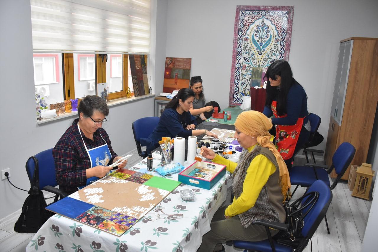 Kurs eğitmeni Behiye Burdurlu’nun öğreticiliğinde, ev hanımlarının çoğunlukta olduğu el sanatları kursu Atatürk Gençlik Merkezi’ndeki modern çalışma alanında yeni eserler çıkarmaya başladı. 14 kursiyerin yer aldığı el sanatları kursunda artık katılımcılar daha geniş alanlarda sergi imkanı bulabilecek. Ayda bir kez düzenlenecek workshop çalışmaları ile katılımcılar daha etkin rol alacak. Duvar çalışmaları, ahşap boyama, seramik boyama, cam boyama ve ahşap üzerine çini desenli işleme çalışmaları ile el emeği göz nuru eserler tamamlandıktan sonra sergilenecek.