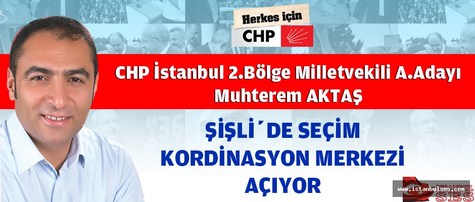 CHP 2.Bölge Milletvekili A. Adayı Av. Muhterem Aktaş seçim çalışmalarını koordine etmek için 15 Mart Saat:15:00'da Abidei Hürriyet Caddesi No:205 Şişli (Şişli Minibüs Durakları Karşısı) adresinde seçim koordinasyon merkezini açacak.