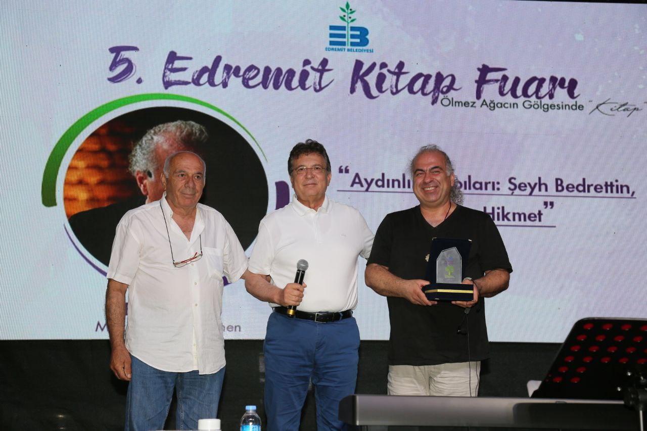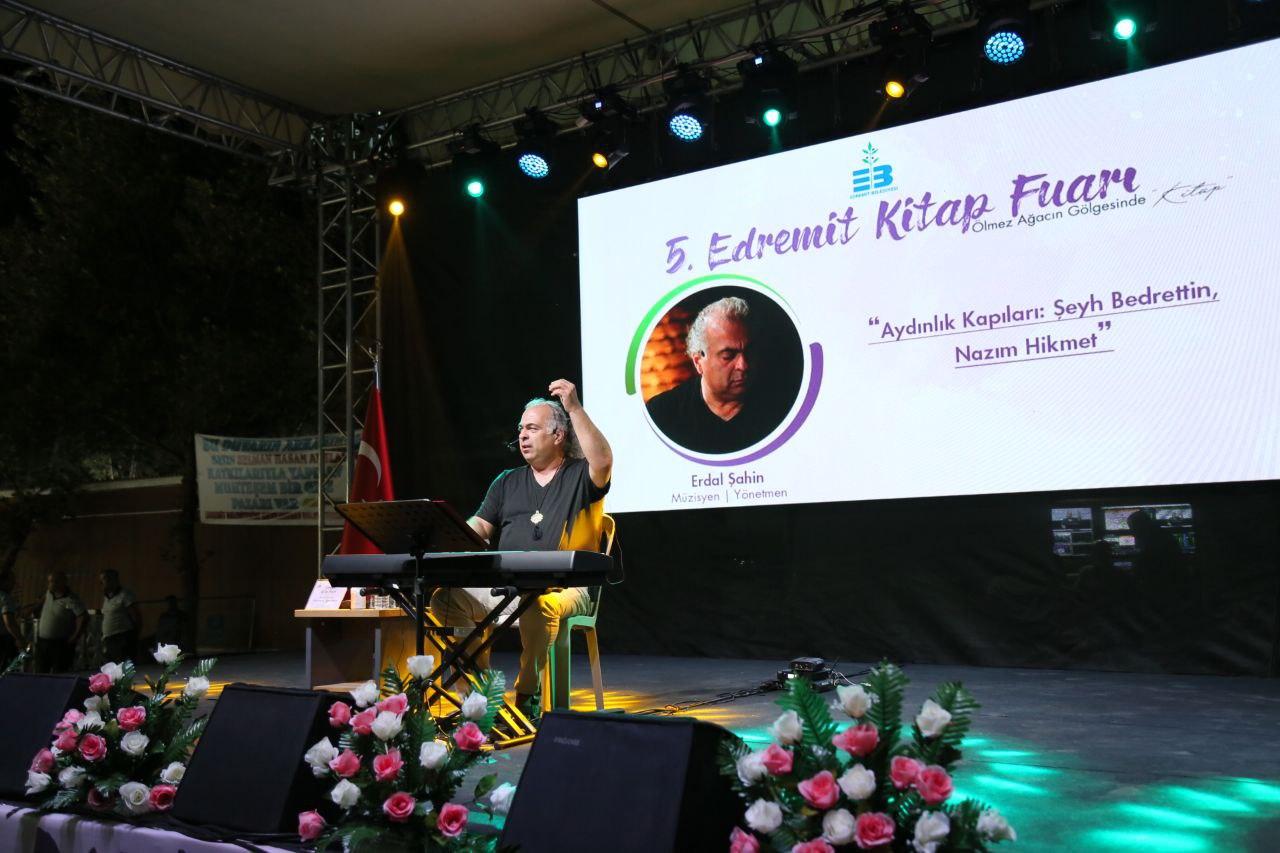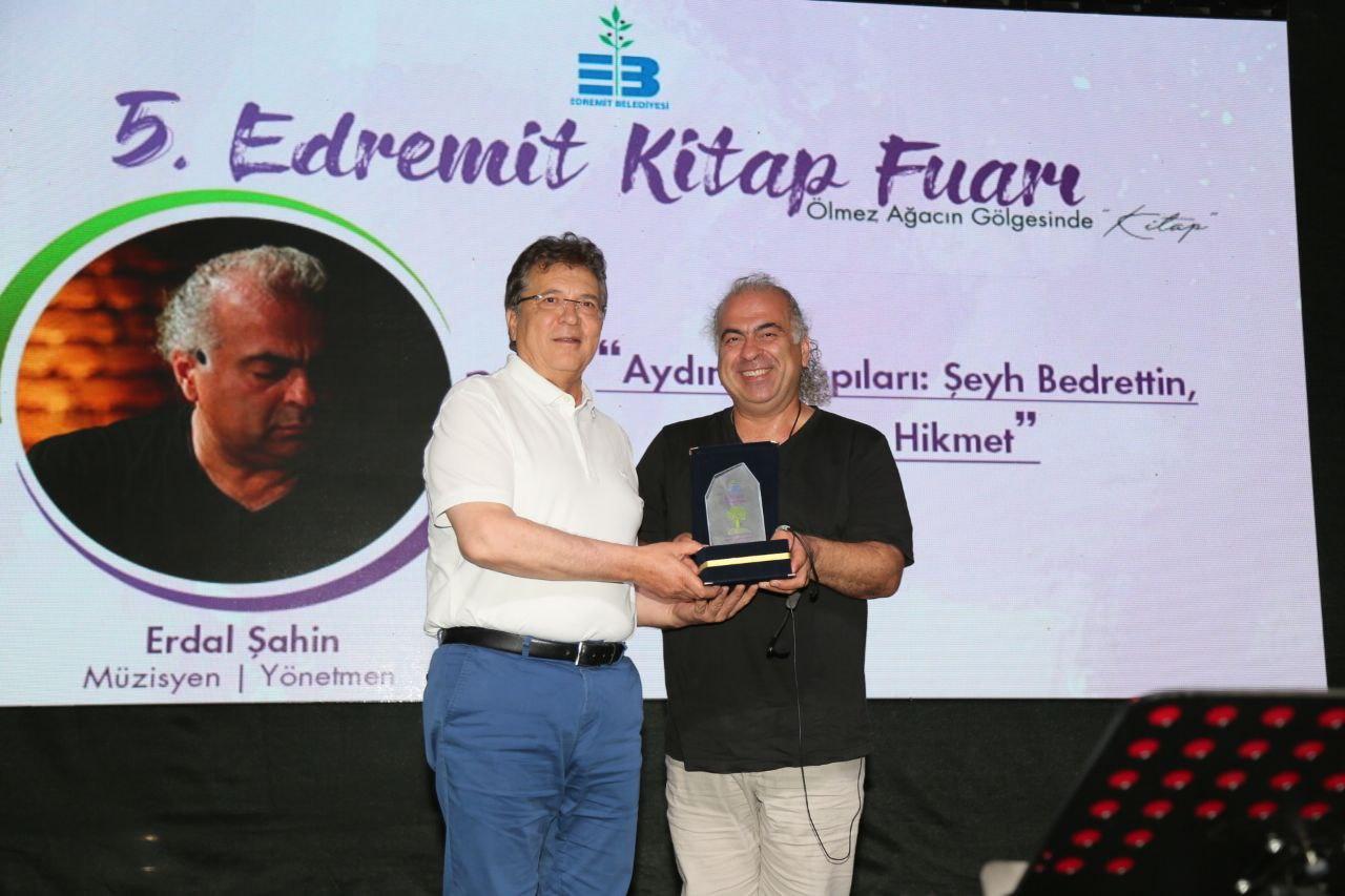 5.Edremit Kitap Fuarı’nın 3. günü Müzisyen ve Yönetmen Erdal Şahin’in dinleyenlere huzur veren “Aydınlık Kapıları: Şeyh Bedrettin, Nazım Hikmet” başlıklı muhteşem dinletisi ile son buldu. Dinletinin ardından Şahin’e plaketini Belediye Başkanı Selman Hasan Arslan, tarafından sahneye davet edilen babası Erdoğan Şahin tarafından verildi.