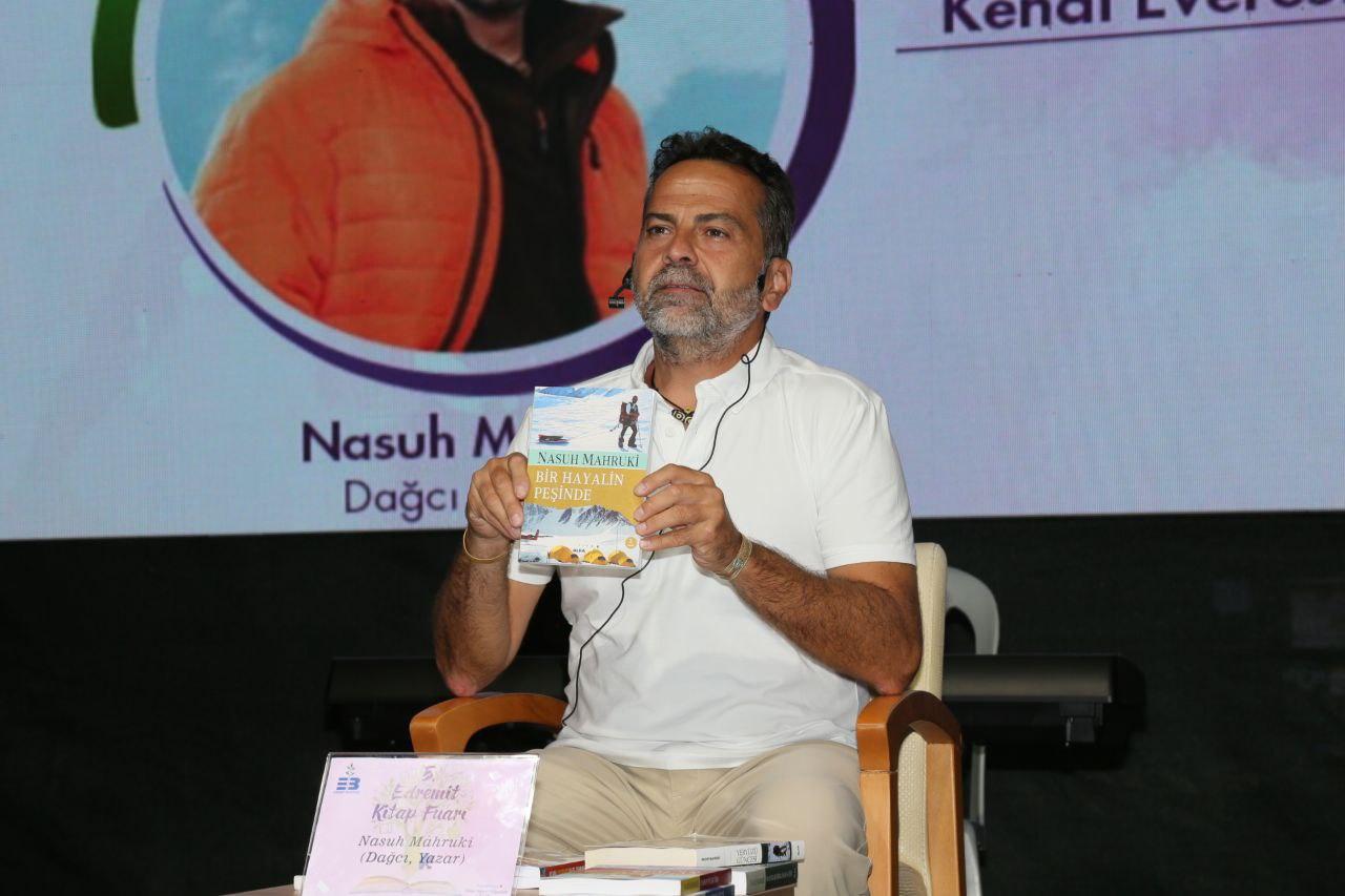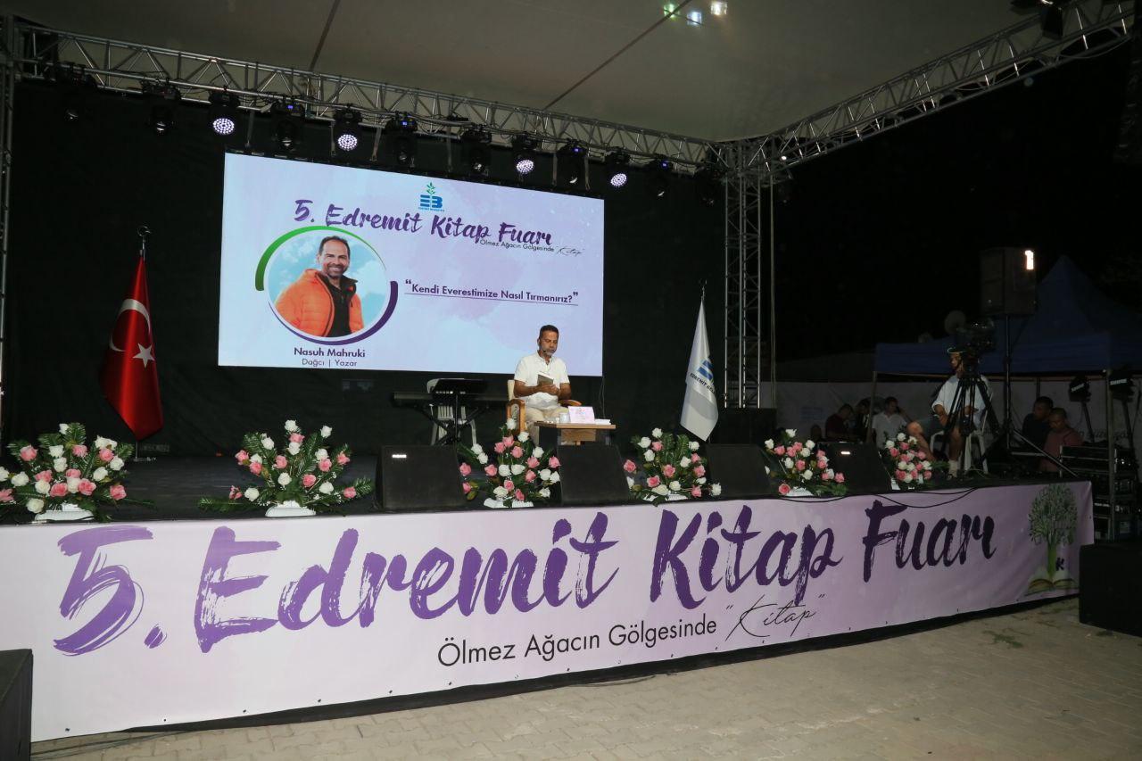 Dağcı kimliğinin yanı sıra yazdığı kişisel gelişim kitaplarıyla da yazar kimliğini öne çıkaran Nasuh Mahruki, kendi başarı öyküsünü 5. Edremit Kitap Fuarı katılımcıları için anlattı. “Ben 20’li yaşlarımda bu yollara girdiğimde önümde hiç örnek, yol göstericim olmadı. İşte bu yüzden ben yaşam yolculuğumu anlatarak herkesin kendi potansiyelini bularak kendi Everest’ine tırmanmasını sağlamak için bir örnek, yol gösterici olmak istiyorum” diyen Mahruki, herkesin önce kendi içine dönmesi, kendini tanıması ve kendi yolunu çizmesi gerektiğini ancak bu şekilde herkesin kendi Everest’ine tırmanabileceğini belirtti. “Herkes kendi hayatını bir sanat eseri gibi işlemeli, bunun için de önce kendi içine dönmelidir. Hayatta gerçek başarı, insanın kendine koyduğu hedeflere ulaşabilmesidir” dedi. Katılımcıların sorularını da yanıtlayan Mahruki’ye plaketini fuarın katılımcılarından genç bir kitapsever takdim etti.