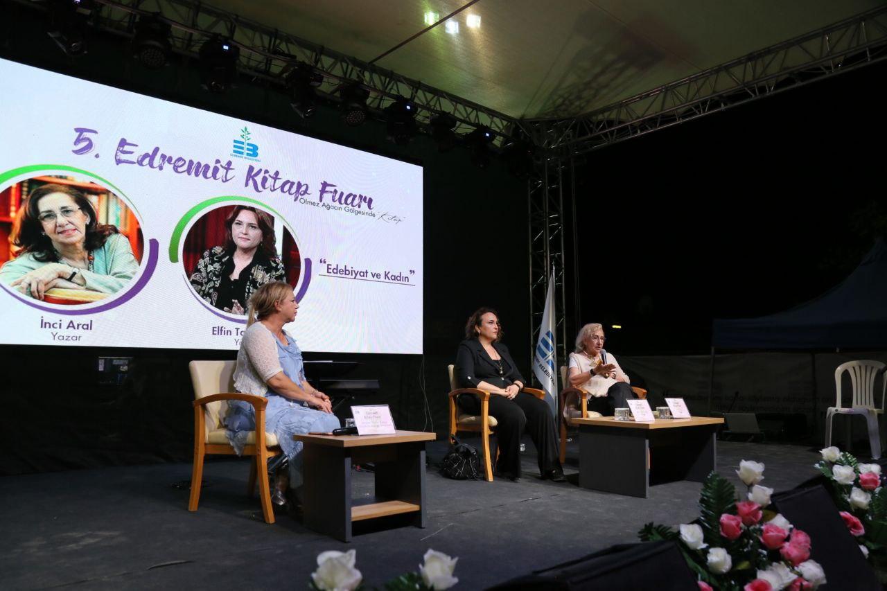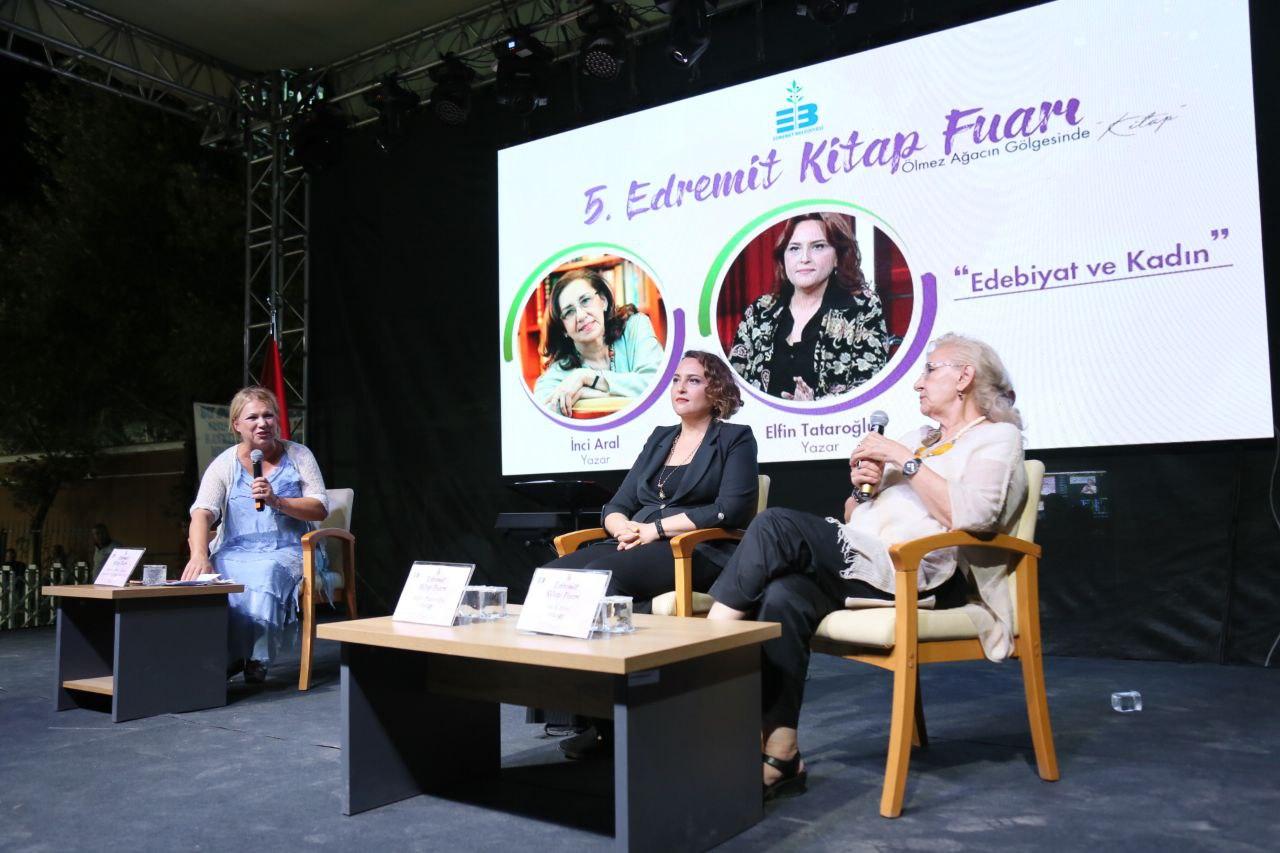 Birsen Temir Saraç moderatörlüğünde gerçekleştirilen söyleşide Yazar İnci Aral ve yazar Elfin Tataroğlu Edebiyat ve Kadın’ı konuştular. Laik, aydın, cumhuriyetçi ve Atatürkçü, edebiyatın önemli iki ismi bugünlere gelmemizde önemli katkıları olan tüm değerleri anarken, kitaplarını nasıl yazdıklarını da okurları için anlattılar. Elfin Tataroğlu, “Aydınlanma kuşaktan kulağa aktarılan bir meşaledir.” Bu meşalenin sönmesine asla izin vermeyeceğiz. Aydınlanma yolunda hayatlarıyla bedel ödeyen ama asla vazgeçmeyen tüm aydınlarımıza Edremit’ten selam olsun” dedi.