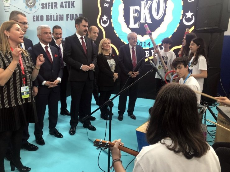 Bakan Kurum fuarda stantları gezerek öğrenciler ile fotoğraf çektirdi ve projeleri hakkında bilgi aldı.