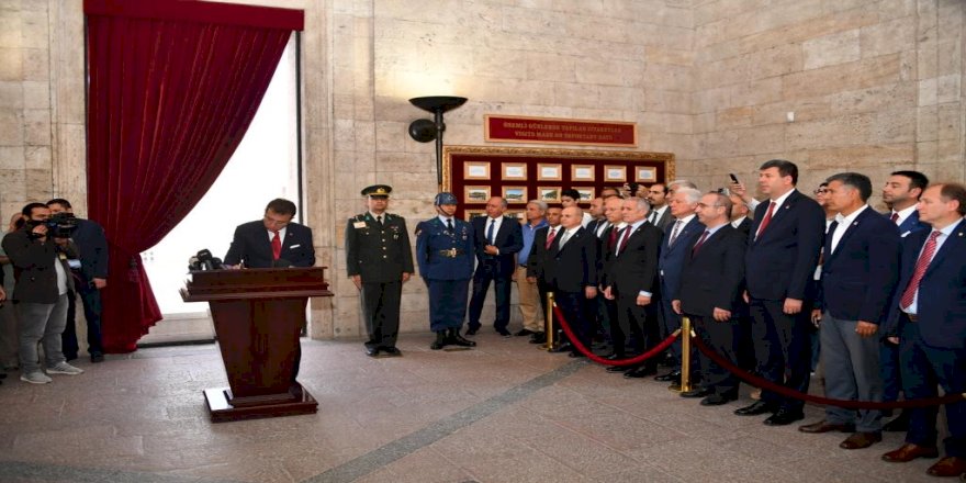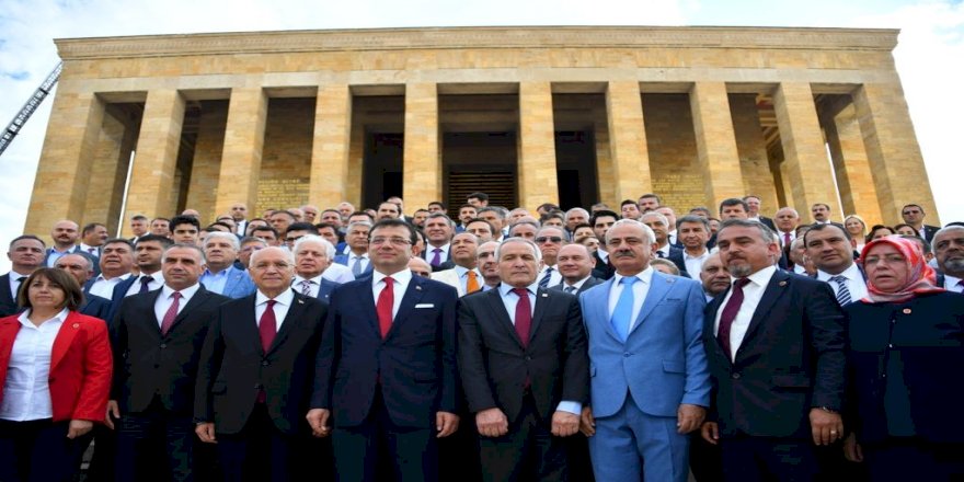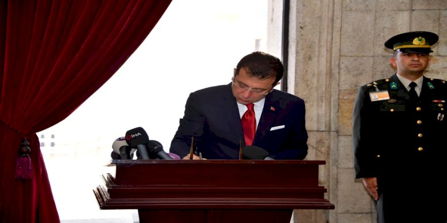 İmamoğlu, toplu fotoğraf çekiminin ardından Anıtkabir özel defterini imzaladı. İmamoğlu, deftere yazdığı, ''Türkiye Cumhuriye'nin kurucusu Mustafa Kemal Atatürk. Bugün manevi huzurunuzda, 1919 yılında başlattığınız Kuvay-i Milliye ruhunun 100. yılında aynı ruhla, 21. yüzyılda, fikri hür vicdanı hür nesiller olarak; akıl ve bilimle cennet vatanımızın en güzel şehri İstanbul'a, tüm tarihi birkimi ve maneviyatını koruyarak, milli unsurlarımızdan asla taviz vermeyerek hizmet edeceğime söz veriyorum. Bu satırların tekrar yazılmasını sağlayan 16 milyon vatansever İstanbullu ile belediye başkanlarımız ve meclis üyelerimizle birlikte aziz hatıranız önünde saygıyla eğiliyorum. Egemenlik kayıtsız şartsız milletindir. Ekrem İmamoğlu. İstanbul Büyükşehir Belediye Başkanı'' cümlelerini kameralar karşısında yüksek sesle okudu.