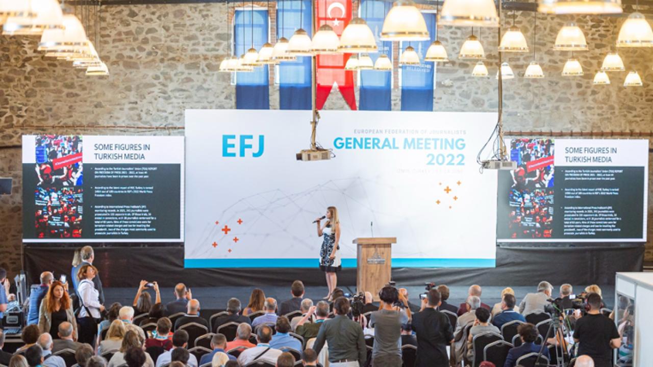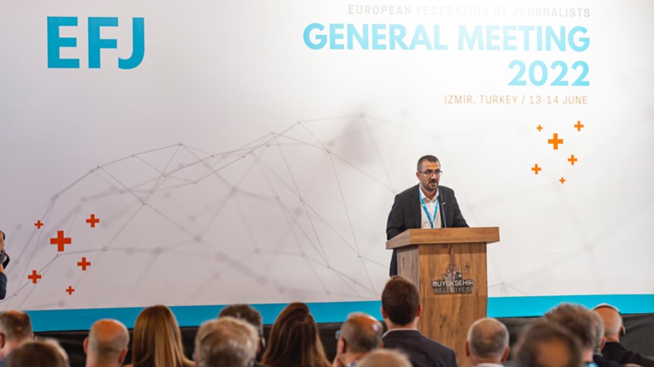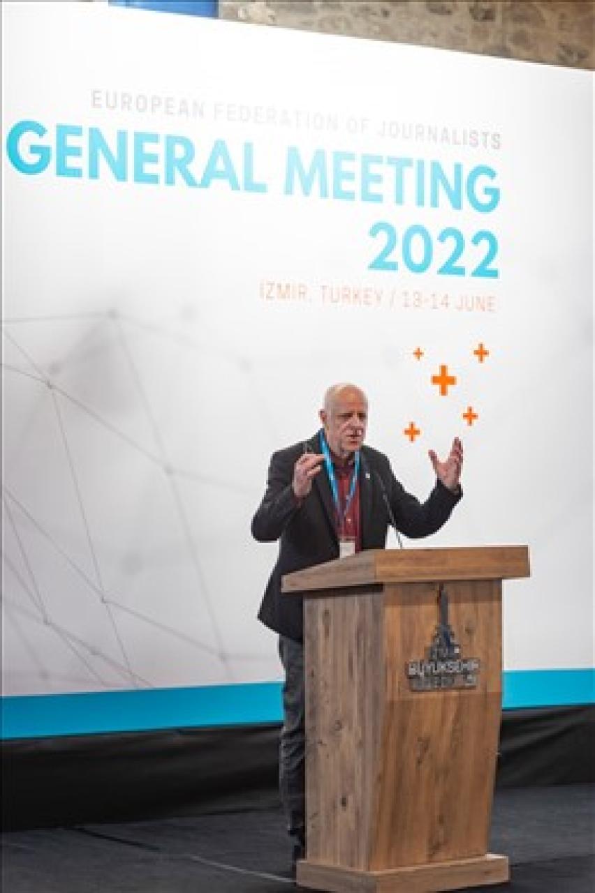 Avrupa Gazeteciler Federasyonu Başkanı Mogens Blicher Bjerregård ise, “Pandeminin ardından sizlerle bir araya gelmek bizim için büyük bir mutluluk. İzmir’de olmaktan çok mutluyuz. Burada hep birlikte İzmir’in güzelliklerini yaşıyoruz. Türkiye’deki gazetecilerin yaşadığı davalarda buradaydım. Tüm gazetecilere sokaklarda kamuoyunda büyük bir destek vardı. Burada gazetecilere verilen değerin ne kadar olduğunu gördük. Türkiye’de bunları görmek gerçekten umut verici. Sizler Türkiye’de gazeteciler olarak yargılandınız. Zamanınızı gazetecilik yerine mahkemelere çıkarak harcadınız. Bu gazetecilere yapılmaması gereken bir şey. Binlerceniz defalarca mahkemelere çağırıldınız. Ülkenizde çok başarılı işler yaptınız. Biliyoruz ki daha yapılacak çok iş var ve biz de bu yüzden buradayız” dedi.