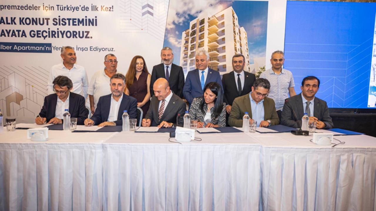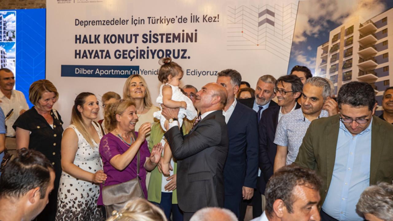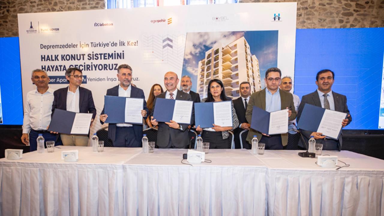 İzmir Büyükşehir Belediyesi’nin depremzedeler için hayata geçirdiği ve Türkiye’de ilk kez uygulanacak Halk Konut projesi başlatıldı. 30 Ekim İzmir depreminde orta hasar alan ve ardından yıkılan Bayraklı’daki Dilber Apartmanı sakinlerinin kurduğu Halk Konut 1 Yapı Kooperatifi temsilcileriyle, İzmir Büyükşehir Belediyesi şirketleri EGEŞEHİR AŞ ve İZBETON AŞ ile Bayraklı Belediyesi şirketi BAYBEL AŞ’nin oluşturduğu ortak girişim yetkilileri arasında tarihi sözleşme imzalandı. Sözleşmeyle İzmir Büyükşehir Belediyesi ve Bayraklı Belediyesi, depremzedelerin kendi konutlarını yapabilmesi için belediye güvencesi ve teknik destek verecek.