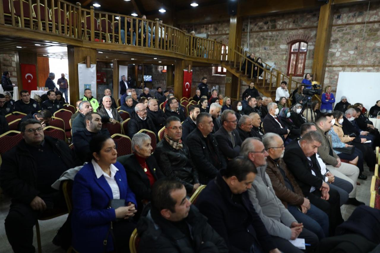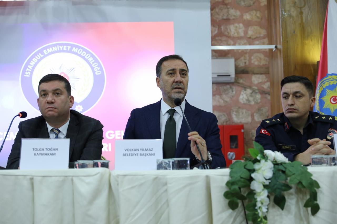 Toplantıda konuşan Başkan Yılmaz, “Huzur, hepimizin ortak temennisi olan bir kelimedir. Huzurun oluşması için en önemli etkenler; sağlık, eğitim, sosyal refah ve güvenliktir. Bunların hepsinin bir arada olduğu yerde huzurdan bahsedebiliriz. Bir şehirde huzur ve güvenliğin tesis edilmesi planlı bir şehrin inşasının yanı sıra; o şehirdeki tüm kamu kurumlarının uyum içerisinde çalışması ve o kentte yaşayan vatandaşlarla iş birliği yapılmasıyla mümkün olur. Biz, göreve geldiğimiz ilk günden beri Silivri’deki kamu kurumlarının arasındaki uyumun sağlanması ve bu uyumun içerisinde aktif rol almak amacıyla çalışmalarımızı sürdürüyoruz. Kaymakamımız Sayın Tolga Toğan’ın riyasetinde yürüttüğümüz başarılı çalışmaların neticesinde, geçtiğimiz yılın verilerine göre İstanbul’un 39 ilçesi bazında suç oranına bakıldığında 36’ncı sırada yer alıyoruz. Yani Silivri, İstanbul’un en huzurlu ilçeleri arasında 4’üncü sırada yer alıyor. Tarihiyle, doğasıyla ve kültürüyle eşsiz bir güzelliğe sahip olan Silivri’mizi daha huzurlu ve güvenli bir hale getirmek adına çalışmalarımızı aralıksız sürdürüyoruz. Böylesine güzel bir ilçede yaşamaktan, bu şehrin her biri birbirinden kıymetli insanlarına hizmet etmekten büyük mutluluk duyuyoruz. Silivri’mizin huzur ve güvenliği için yapılan hizmetlerle ilgili teşekkür etmemiz gereken isimler var: Silivri İlçe Emniyet Müdürlüğü, İlçe Jandarma Komutanlığı ve Selimpaşa Şehit Emin İpşir Polis Merkezimizin hayata geçmesini, Sahil Güvenlik Komutanlığı binamızın yapımına başlanmasını, bütün köyler ve mahallelerimize MOBESE kamerası kurulmasını sağlayan İçişleri Bakanımız Sayın Süleyman Soylu’ya, Silivri’de yaşayan bütün vatandaşlarım adına şükranlarımı sunuyorum. Ayrıca Silivri’mizde huzur ve güven ortamının tesisi ve teminine katkı sağlayan tüm kurumlarımıza, güvenlik güçlerimize ve onlarla iş birliği içerisinde olan Silivrili hemşehrilerimize teşekkür ediyorum.” dedi.