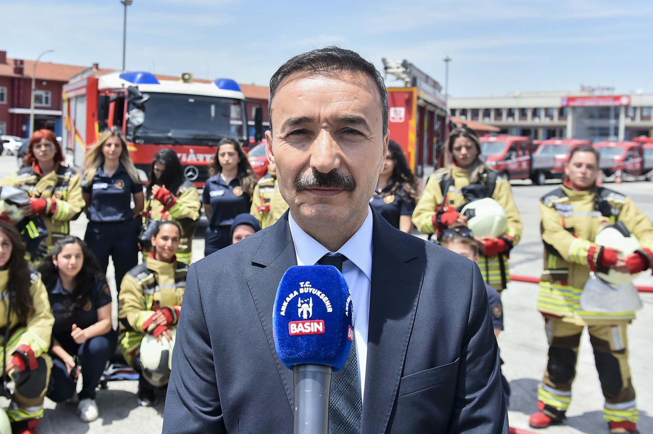Tatbikatta yangın söndürme tekniklerini başarıyla uygulayan kadın itfaiyecileri tebrik edenAnkara Büyükşehir Belediyesi İtfaiye Daire Başkanı Salih Kurumlu, 12 kadın itfaiyecinin ilk kez yangına müdahale ekibinde yer alacağını açıkladı: