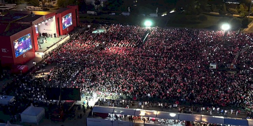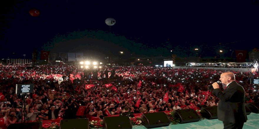 Hiçbir ihanet şebekesinin, hiçbir terör örgütünün birliği, beraberliği, kardeşliği asla bozamayacağını ifade eden Erdoğan, “Öyleyse ne diyoruz? Tek millet, tek bayrak, tek vatan, tek devlet. Bir olacağız, iri olacağız, kardeş olacağız, hep birlikte Türkiye olacağız. Bundan taviz vermeyeceğiz. Ruhlarını iblise satanlar var. O müptezeller Türkiye'yi ele geçiremeyecekler.” ifadelerini kullandı.