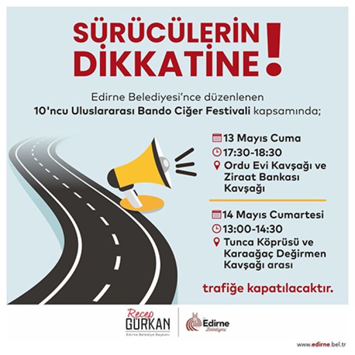 Edirne Belediyesi Ulaşım Müdürlüğü tarafından yapılan açıklamaya göre, 13 Mayıs Cuma günü düzenlenecek olan kortej yürüyüşü nedeniyle Orduevi Kavşağı ile Ziraat Bankası Kavşağı arası 17.30 ile 18.30 saatleri arasında trafiğe kapalı olacak. 14 Mayıs Cumartesi Günü ise Saat: 13.00 ile 14.30 saatleri arasında Tunca Köprüsü ile Karaağaç Değirmen Kavşağı arası trafiğe kapalı olacak. Vatandaşlar, söz konusu tarih ve saatlerde alternatif güzergahları kullanabilir.