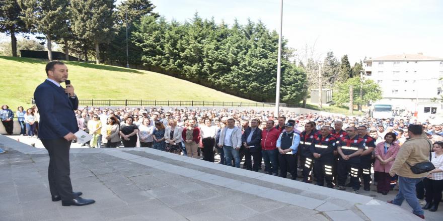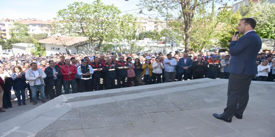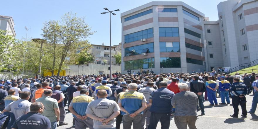 Silivri Belediye Başkanı Volkan Yılmaz, belediye hizmet binası arkasında personeli ile bir araya gelerek 1 Mayıs Emek ve Dayanışma Günü’nü kutladı. Çalışma arkadaşlarına seslenen Başkan Yılmaz, birikmiş ikramiyelerin ilk diliminin ödeneceğini müjdeleyerek, “Çalışanlarımıza alın teri kurumadan ücretinin ödenmesi gerekir. Bu bir başlangıç olsun, arkası seri adımlarla gelir inşallah” dedi. Yeni görev dönemine ilişkin bilgilendirme yaptıktan sonra Başkan Yılmaz, personelin durumu hakkında önemli bir konuşma gerçekleştirdi. Özellikle vatandaşlara güler yüzlü hizmet verilmesi için uyarı yapan Başkan Yılmaz, adalet ve eşitlik ilkelerinden asla taviz verilmeyeceğinin altını çizdi.