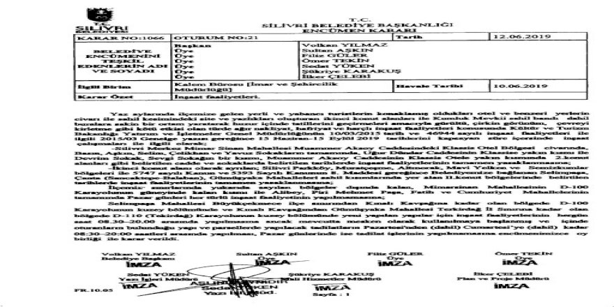 -Silivri Merkez Mimar Sinan Mahallesi Muammer Aksoy Caddesindeki Klassis Otel Bölgesi civarında Basın, Aşkın, Selim, Çelikhan ve Yavuz Sokaklarının tamamında, Uğur Dündar Caddesinin Klassis’e yakın kısmı ile Devrim Sokak, Sevgi Sokak’ın bir kısım, Muammer Aksoy Caddesinin Klassis Otele yakın kısmın da 2.konut alanları gibi belirtilen cadde ve sokaklarda belirtilen tarihlerde inşaat faaliyetlerinin tamamen yasaklanmasına;