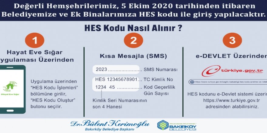 Değerli Hemşehrilerimiz, 5 Ekim 2020 tarihinden itibaren Belediyemize ve Ek Binalarımıza HES kodu ile giriş yapılacaktır. Hayat Eve Sığar (HES) kodunuzu, https://hayatevesigar.saglik.gov.tr/hes.html web sitesinden veya kısa mesaj ile HES boşluk (T.C. Kimlik No) boşluk (Kimlik Seri No son 4 hanesi) boşluk kodun geçerli olması istenilen gün sayısı veya SÜRESİZ yazıp 2023'e SMS atarak alabilirsiniz.