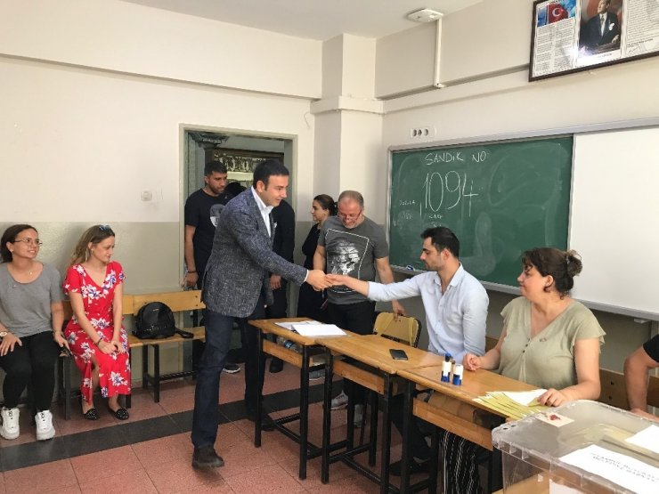 Sınıftan ayrılarak okulun önüne inen Başkan Akpolat, "Oyumuzu kullandık, ülkemize, ilimizi ve ilçemize hayırlı olmasını diliyoruz. Çok yoğun bir katılım var, bu da bizi mutlu ediyor" dedi.