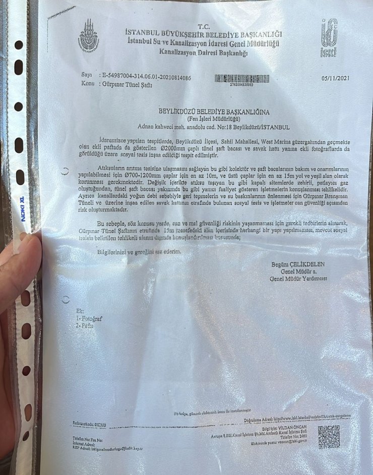 İSKİ tarafından 2021 yılında belediyeye gönderilen raporda bölgede sosyal bir tesise izin verilmemesi isteniyor. Raporda "Değişik içerikte atık su taşıyan bu gibi sistemlerde zehirli, patlayıcı gaz oluştuğundan, tünel şaft bacası yakınında bu gibi işletmelerin konuşlanması tehlikelidir" ifadelerine yer veriliyor. Rapora rağmen atık su hattının yanında bulunan özel bir plaj dikkat çekiyor. Yine İSKİ tarafından verilen raporda, alanda faaliyet gösteren işletmelerin belirlenen tehlikeli alanın dışına taşınması hususunda ilgili kurumlara yazı gönderildiği belirtilirken, işletmenin alandan yıllar geçmesine rağmen taşınmayarak faaliyetlerini sürdürmeye devam ettiği öğrenildi. Plaj üzerinde bulunan yapıların ve işletmenin ruhsatsız olduğunu iddia edilirken, çevredeki esnaf ve vatandaşlar yetkililerin konuya bir an önce müdahale etmesini istedi.