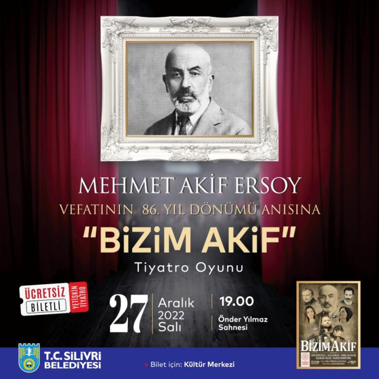 Silivri Belediye Başkanı Volkan Yılmaz’ın göreve gelmesinin ardından kültür ve sanat etkinliklerine aralıksız devam eden Silivri Belediyesi, anlamlı bir etkinliğe daha imza atıyor. İstiklal Marşı’mızın yazarı Şair Mehmet Akif Ersoy’un vefatının 86. yıl dönümü anısına “Bizim Akif” isimli bir tiyatro oyunu sahneliyor. 27 Aralık 2022 Salı günü saat 19.00’da Önder Yılmaz Sahnesinde gerçekleştirilecek tiyatro oyununa Silivrililer ücretsiz olarak katılım sağlayabilecek. Oyuncular Cem Kurtoğlu, Seza Kırgız, Emre Uluocak, Negihan Yıldız, Barış Demirtürk ve Emin Olcay performanslarıyla, İstiklal Şairi Mehmet Akif Ersoy’un hikâyesini Silivrili sanatseverlere aktaracak. Tiyatro oyununa katılmak isteyen Silivrililer, Piri Mehmet Paşa Mah. Hacı Pervane Sk. Mis Çıkmazı Silviya İş Merkezi, No: 1, Kat: 3 adresinde bulunan Silivri Belediyesi Kültür ve Sosyal İşler Müdürlüğüne müracaat ederek biletlerini ücretsiz bir şekilde alabilirler.