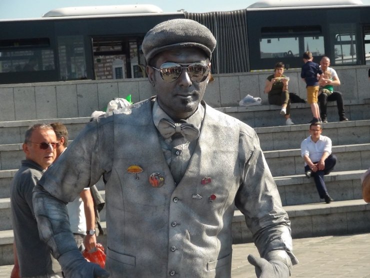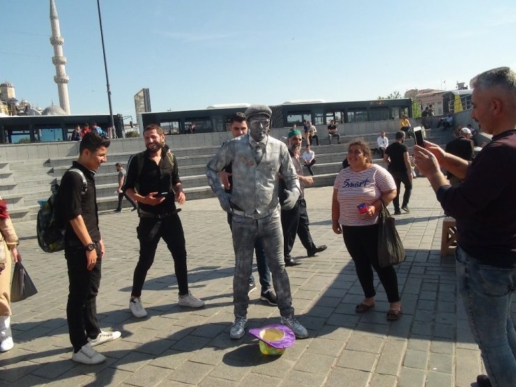 Eminönü Meydanı'nda kendini ve kostümünü griye boyayarak gösteri yapan canlı heykel sanatçısı vatandaşların ilgi odağı oldu.