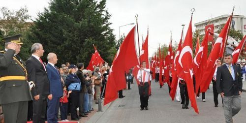 Coşku ve beraberliğin ön plana çıktığı kutlamalarda, ilk olarak protokol üyeleri vatandaşın ve öğrencilerin bayramını kutladı.