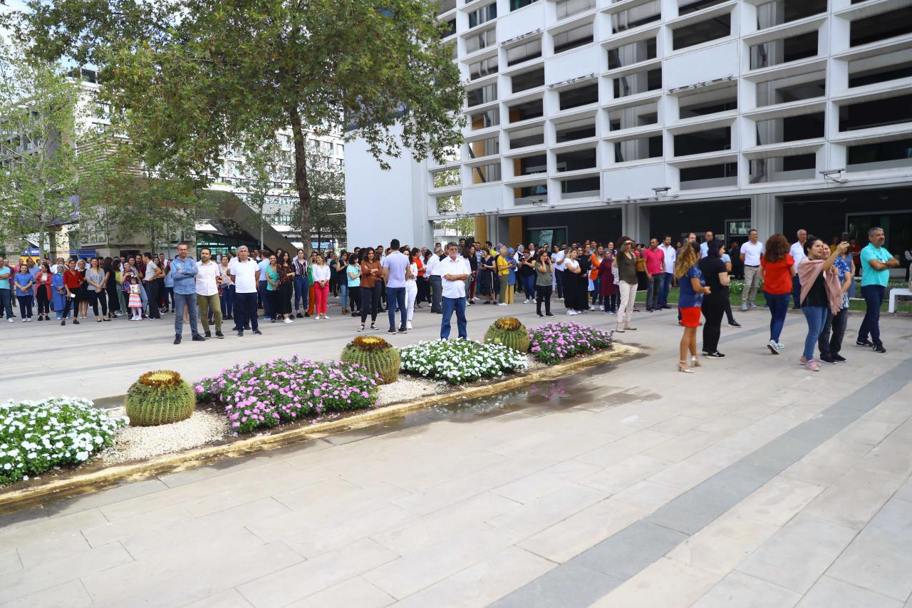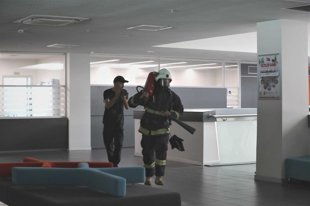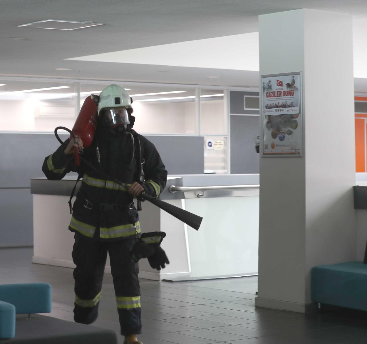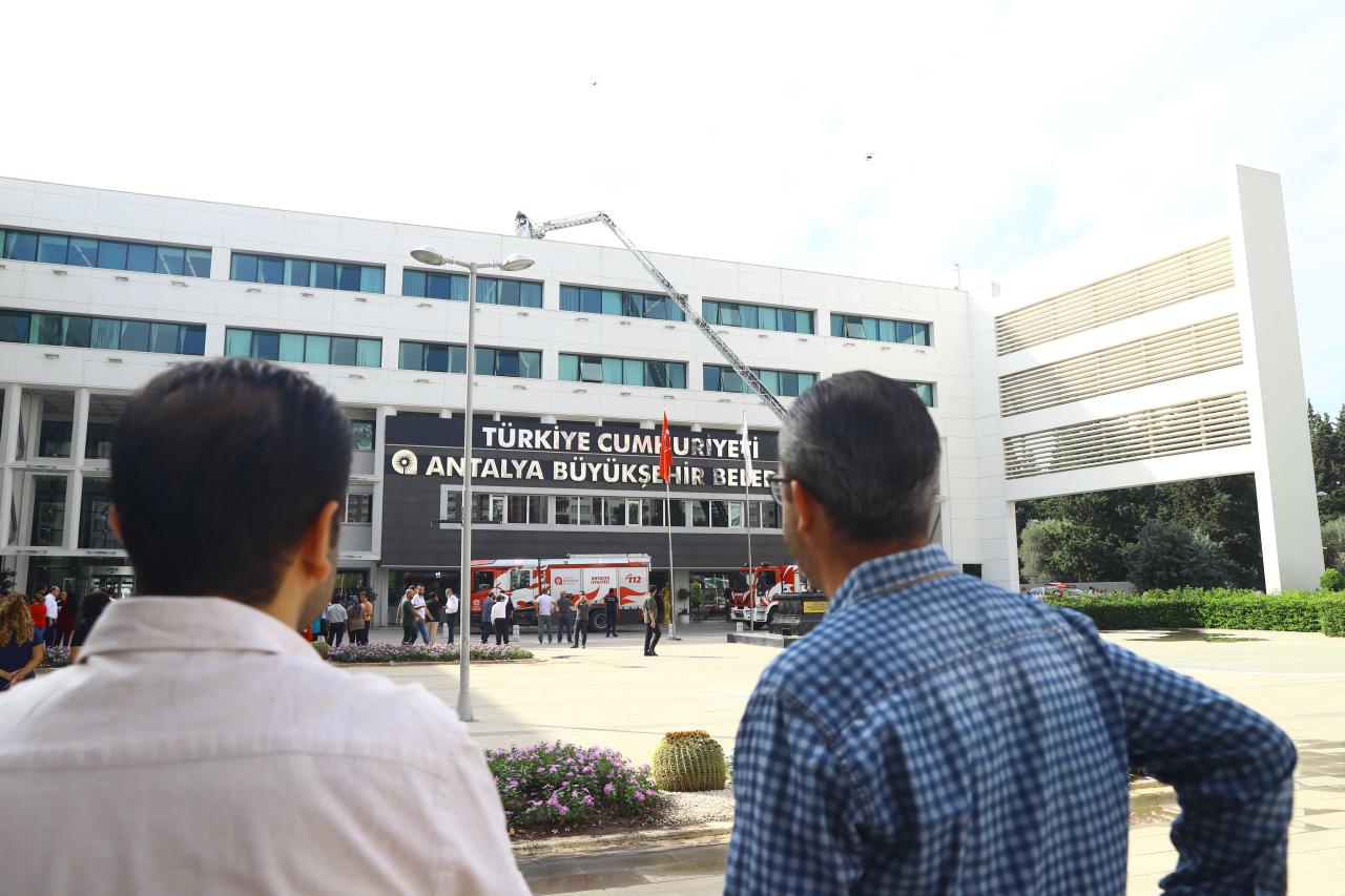 Antalya Büyükşehir Belediyesi Ana Hizmet Binası’nda Afet ve Acil Durum tatbikatı gerçekleştirildi. Senaryo gereği meydana gelen depremin ardından bina içerisinde bulunan personel ve vatandaşlar toplanma alanına tahliye edildi. Binadan çıkamayanlar ise masa altlarında ve güvenli yerlerde çök, kapan, tutun hareketi yaparak kendilerini korumaya çalıştı. Bu sırada Antalya Büyükşehir Belediyesi Ana Hizmet Binası’nın 4. katında bulunan Bilgi İşlem Dairesi Başkanlığı’na bağlı sistem odasında yangın çıkması üzerine belediye personeli kendi imkanlarıyla yangını söndürmeye çalıştı. Ancak başarılı olmayınca itfaiyeye haber verildi.