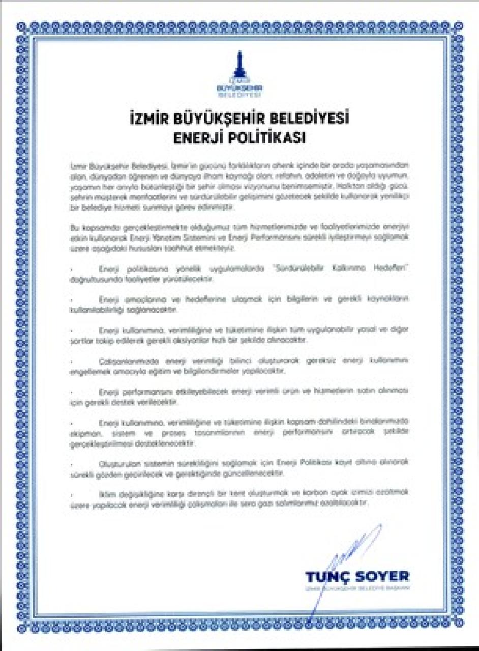 İzmir Büyükşehir Belediyesi'nin Türkiye'ye örnek çevre uygulamaları devam ediyor. İzmir Büyükşehir Belediyesi ve şirketlerinin enerji ihtiyacını yenilenebilir kaynaklardan sağlamak için İZENERJİ bünyesinde İZETAŞ şirketi kurarak elektrik bütçesinden yüzde 22 tasarruf sağlayan Büyükşehir Belediyesi, Birleşmiş Milletler (BM) Sürdürülebilir Kalkınma Hedefleri’ni ve iklim krizi konusundaki duyarlığı temel alan bir enerji politikası oluşturdu. Enerji verimliliği çalışmaları kapsamında sağlanacak enerji tasarrufu ile karbon salımının önüne geçmeyi ve yaratılan ilave kaynağı kurumun diğer hizmetlerine aktarmayı hedefleyen Büyükşehir Belediyesi, hazırladığı 8 maddelik taahhütü "Kurum Enerji Politikası" başlığı altında belediyenin web sayfasında yayımlandı. Hemen ardından binalarına ISO 50001 Enerji Yönetim Sistemi belgesi almak için de harekete geçti.