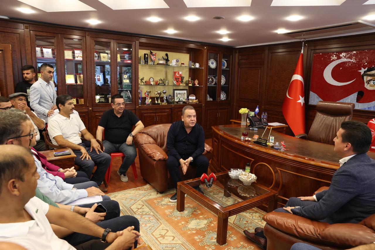 Antalya Büyükşehir Belediye Başkanı Muhittin Böcek, Genel Sekreter Cansel Tuncer, Genel Sekreter Yardımcıları ve Daire Başkanları ile birlikte Kumluca’da ziyaret ve açılışlar gerçekleştirdi. Başkan Böcek, ilk olarak Kumluca Belediye Başkanı Mustafa Köleoğlu’nu ziyaret etti. Başkan Böcek, Kumluca ve Antalya’ya yakışan hizmetler yapmaya devam edeceklerini belirterek, Kumlucaspor’un Süper Amatörde Lig’de mücadele ederken şampiyon olarak Bölgesel Amatör Lig’e (BAL) yükselmesinden dolayı tebrik etti. Kumluca Belediye Başkanı Mustafa Köleoğlu da Başkan Böcek’e Kumluca’ya yaptığı hizmetlerden dolayı teşekkür ederek, “Özellikle tarımla ilgili ilklerin hizmetlerini gerçekleştiriyorsunuz. Kumlucalı bütün üreticilerin derdine derman oluyorsunuz” dedi. Köleoğlu, Başkan Böcek’e Kumlucaspor şapkası hediye etti.