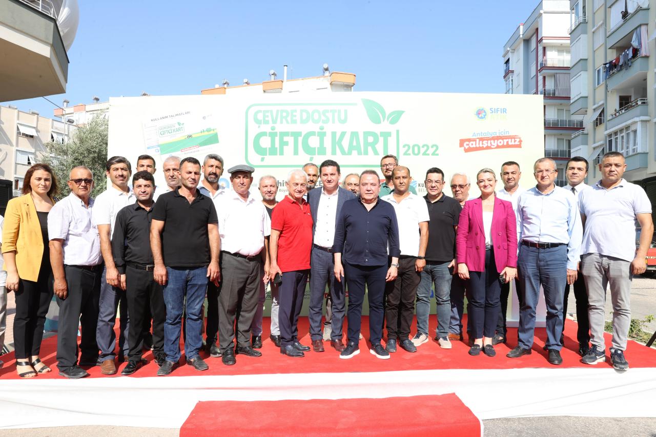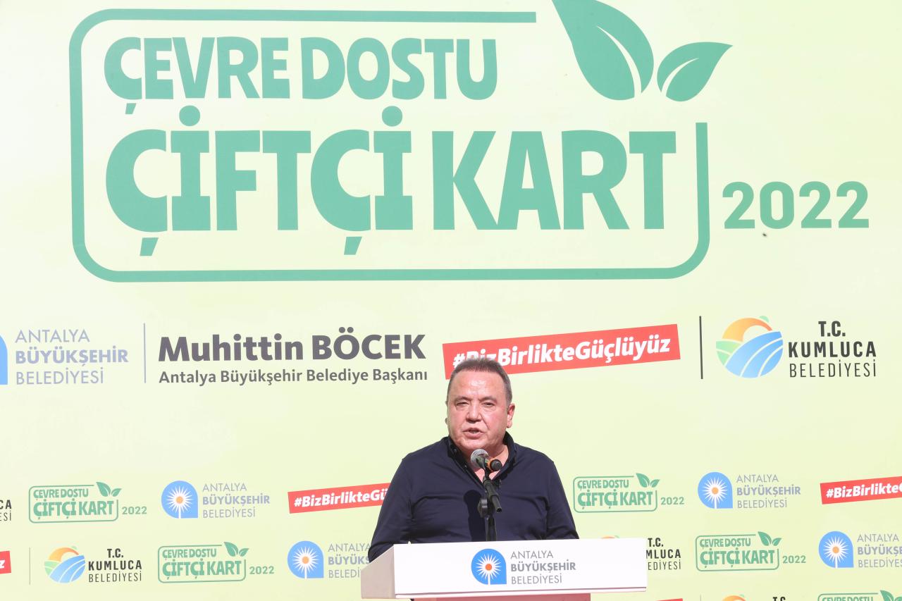 Başkan Böcek Beykonak Sulama Tesisi açılışının ardından, Antalya Büyükşehir Belediyesi Çevre Kurulu’nda zirai ambalaj atıkları sorunun çözümüne yönelik ilgili kurum ve kuruluşlarla yapılan çalışmalar doğrultusunda, tarımsal üretimin en yoğun olduğu ilçeler arasında yer alan Kumluca’da, “Çevre Dostu Çiftçi Kart” projesini başlattı. Antalya Büyükşehir Belediye Başkanı Muhittin Böcek, Kumluca Belediye Başkanı Mustafa Köleoğlu, Finike Belediye Başkanı Mustafa Geyikçi, Kumluca Ziraat Odası Başkanı Hidayet Kökçe ve çok sayıda çiftçinin katılımıyla “Çevre Dostu Çiftçi Kart” projesi, Kumluca Ziraat Odası’nda tanıtıldı.