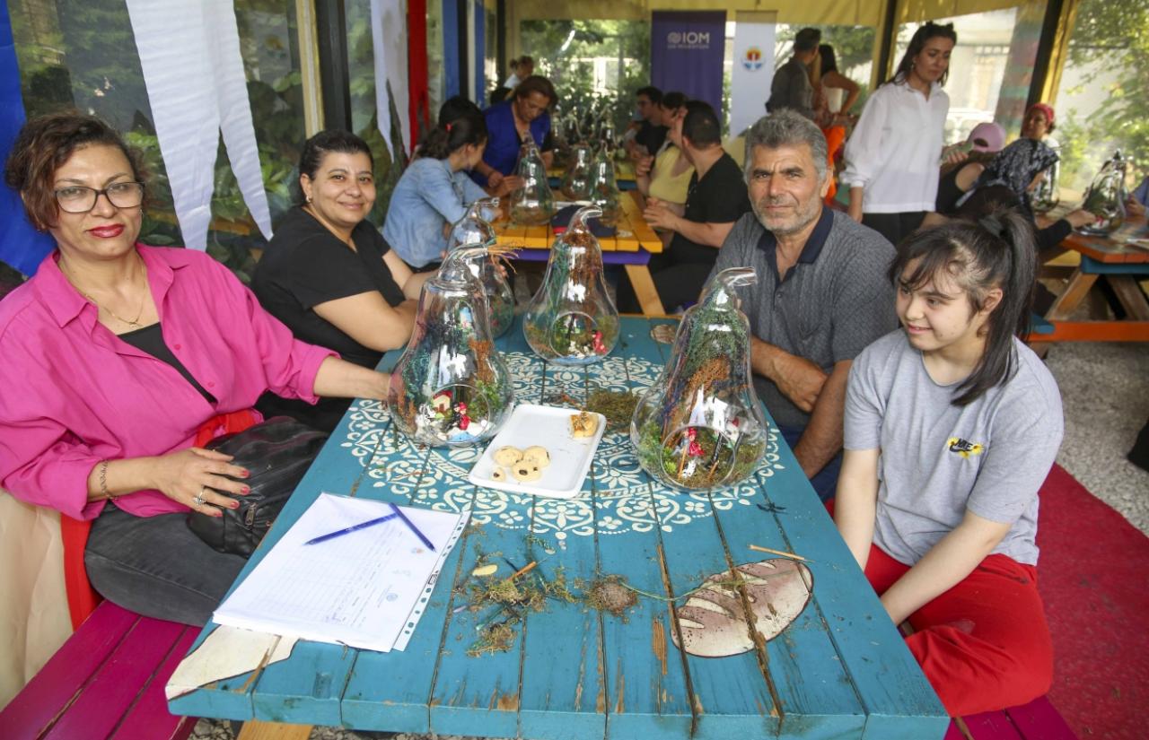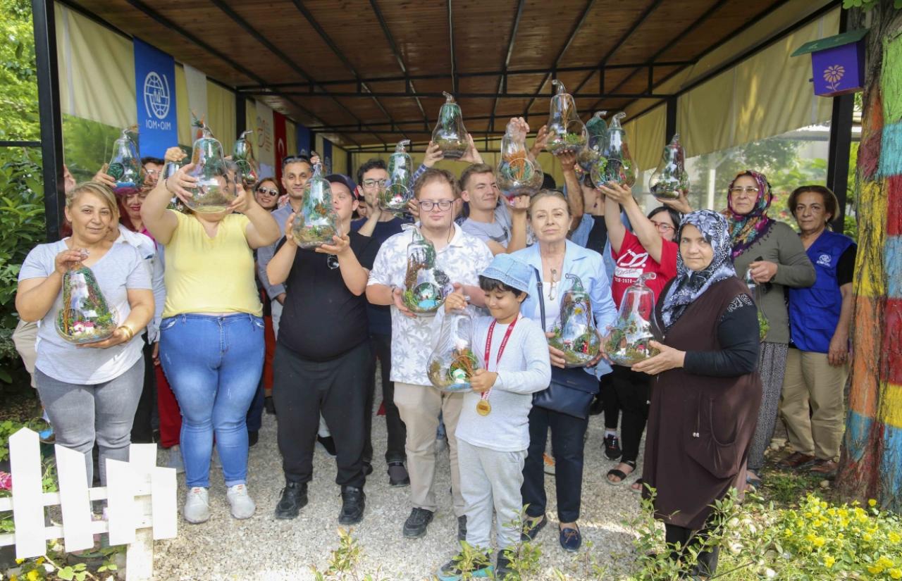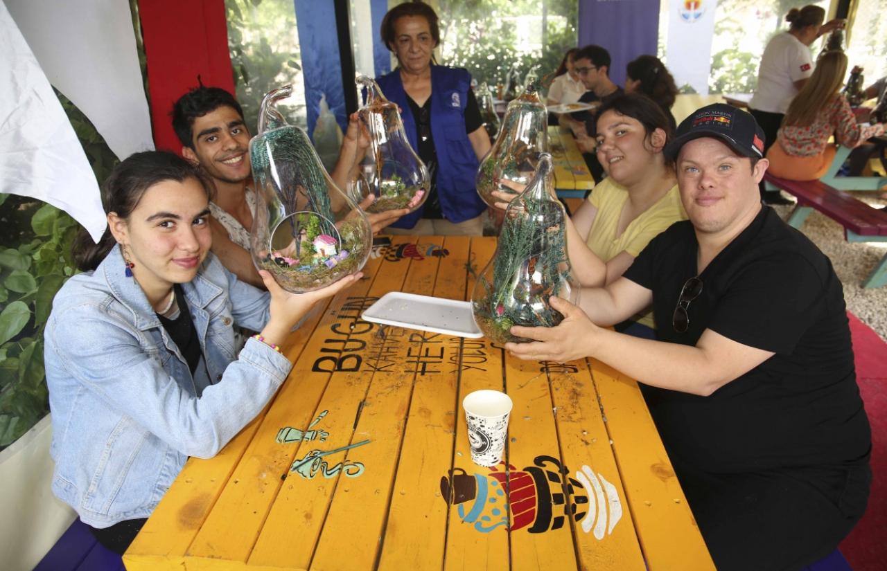 Atölyemasaları etrafında engelli bireyler ve aileleri kendi tasarımları olan teraryumlarıel emekleri ile yaparak gün sonunda birbirlerine hediye ettiler.