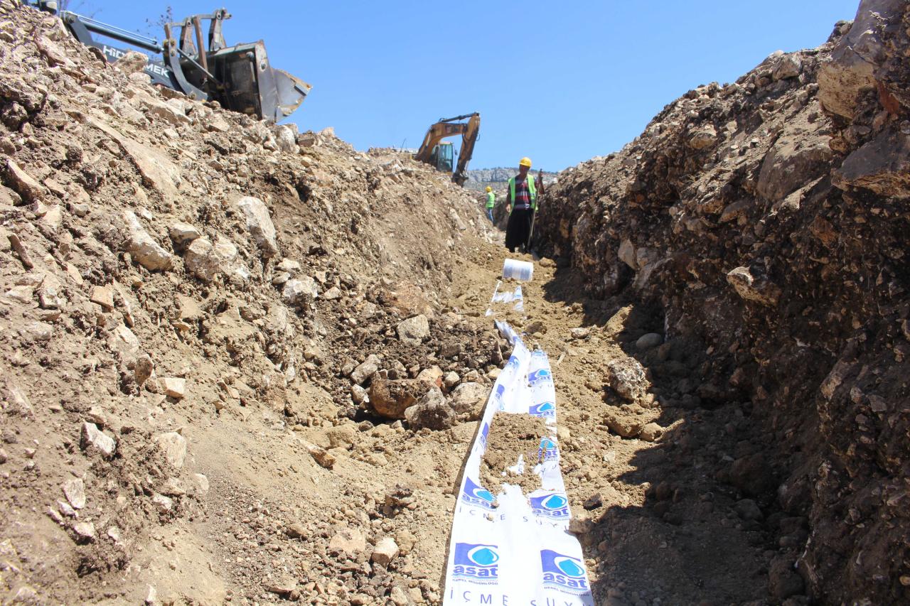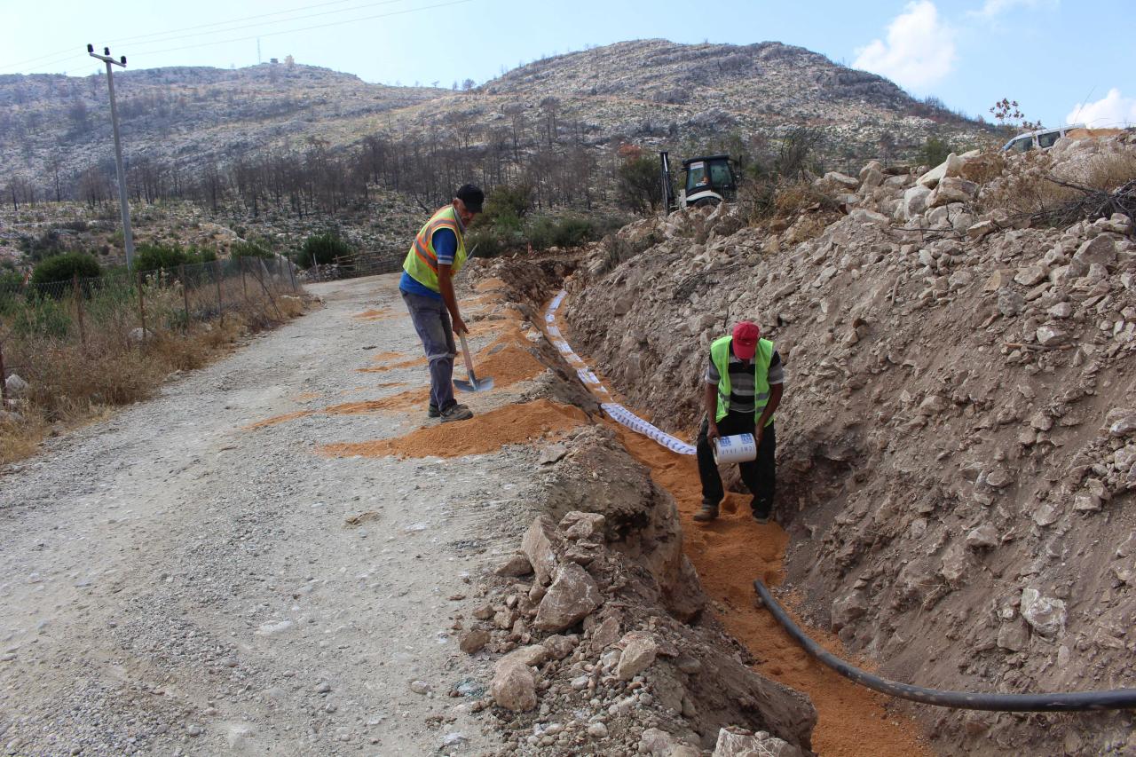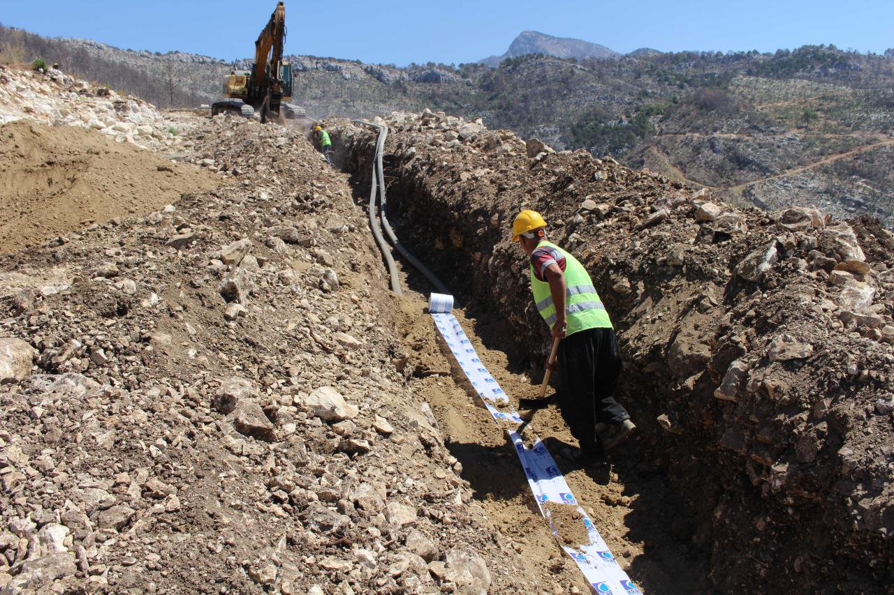Manavgat ilçesinde çıkan büyük yangında zarar gören, sık sık patlayan, ekonomik ömrünü dolduran hatlar Büyükşehir Belediyesi ASAT Genel Müdürlüğü tarafından yenilenirken, içme suyu hattı bulunmayan bölgelerde de imalat çalışması gerçekleştiriyor. Bu kapsamda coğrafi olarak zor bir bölgede olan Manavgat ilçesi Sırtköy Mahallesi’nde içme suyu hattı olmayan mevkilere içme suyu boruları döşeniyor. ASAT ekipleri, Sırtköy sakinlerini suya kavuşturmak için engebeli ve taşlık alanda zor şartlar altında çalışmalarına aralıksız devam ediyor. Ekipler en kısa sürede imalat çalışmalarını bitirip vatandaşları kesintisiz ve sağlıklı içme suyuna kavuşturmayı hedefliyor.