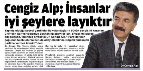 Gazetemize açıklamalarda bulunan, Dr. Cengiz Alp, Yapmış olduğu sosyal yardımlar ile vatandaşların büyük sevgisini kazanıyor. Cengiz Alp,”İnsanlar iyi şeylere layıktır,. İnsan yaşamının en önemli anlarında, yanlarında olmaktan, iyi günde, kötü günde onlara hizmet etmekten, Mutluluk duyuyorum.30 yıla yakın bir sürede Sarıyer’de özel sağlık hizmeti vermekteyim. Hayatımın büyük bir bölümünü Sarıyer’de geçirdim. İnsanlara hizmet etmek bana mutluluk veriyor” dedi
