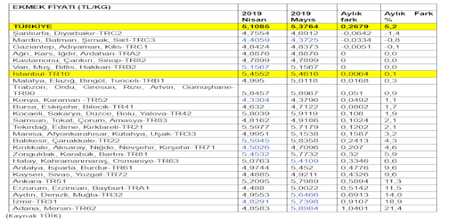 “Nisan-Mayıs aylarında Türkiye genelinde 1 kg ekmeğin fiyatı yüzde 5,2 artarak 5,1 TL’den 5,32 TL’ye yükseldi. Ancak, İstanbul’da ekmeğin fiyatındaki artış, aynı dönemde İstanbul’da Ekrem Başkanın yaptırdığı halk emek indirimi sayesinde binde bir civarında kaldı. Ayrıca, Ekrem Başkan’ın girişimi ile düşürülen öğrencilerin belediye otobüs ücretleri de enflasyona olumlu yansıdı. Mayıs 2019’a Türkiye genelinde yaklaşık binde bir oranında zamlanırken; İstanbul’da ortalama belediye otobüs ücretleri yüzde 2,78 ucuzlayarak 1,79 TL’den 1,74 TL’ye indi.”
