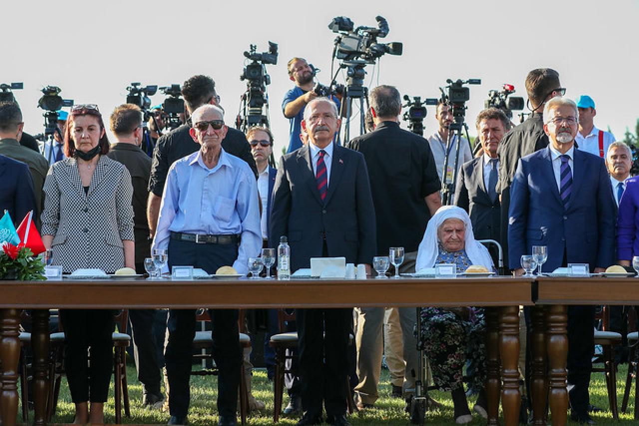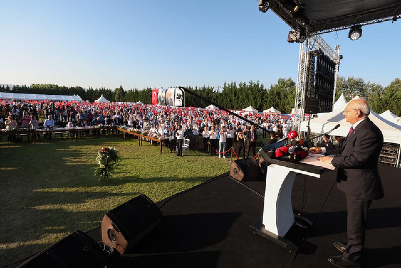 CHP Genel Başkanı Kemal Kılıçdaroğlu burada yaptığı konuşmada; Türkiye Cumhuriyeti'nin kurucusu ve Birinci Cumhurbaşkanı Mustafa Kemal Atatürk'ün mücadelesine değinirken, "Mustafa Kemal’in ideali demokrasiydi, hak, hukuk, adaletti. Mustafa Kemal, sadece bizim Mustafa Kemal’imiz değil, unutmayın; bütün mazlum ulusların Mustafa Kemal’idir... Cumhuriyet’in yüzüncü yılında Cumhuriyet’imizi demokrasi ile taçlandıracağız. Bunun mücadelesini veriyoruz. Cumhuriyet’imizi demokrasi ile taçlandırdığımızda nasıl büyüdüğümüzü, nasıl kalkındığımızı, nasıl güçlendiğimizi sadece biz değil bütün dünya görecek… Bunun sözünü veriyorum, yeter ki bizlere güvenin. Bizim saraylara ihtiyacımız yok. Bizim Çankaya’da oturan onurlu insanlara ihtiyacımız var" diye konuştu.