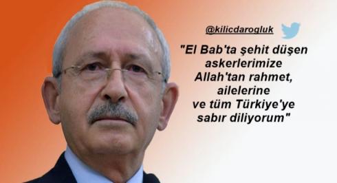 Genel Başkan Kemal Kılıçdaroğlu Twitter hesabından paylaştığı mesajda, "2 gündür acı haberler alıyoruz. El Bab’ta şehit düşen askerlerimize Allah’tan rahmet, ailelerine ve tüm Türkiye’ye sabır diliyorum. Yanlış politikalar uygulayarak Ortadoğu bataklığına saplanan, her gün ayrı bir şehit haberi ile yüreği yanan bir ülke haline geldik. Askerlerimizin şehit edilmesi, Rusya tarafından kuru bir başsağlığıyla geçiştirilemeyecek kadar önemli bir hadisedir!" değerlendirmesinde bulundu.
