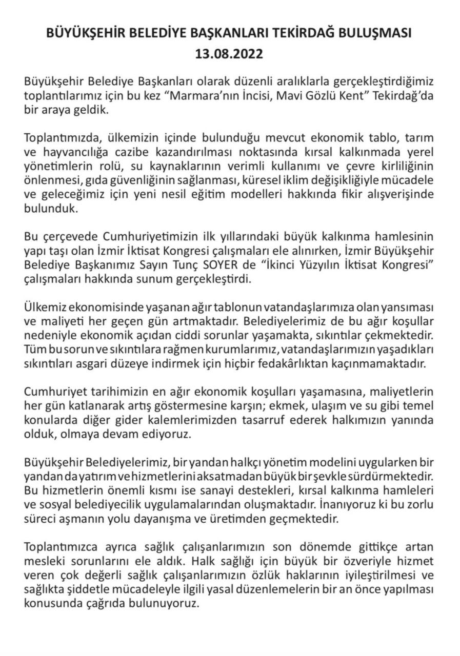 CHP’li büyükşehir belediye başkanları geleneksel hale gelen ‘Büyükşehir Belediye Başkanları Buluşması’nın 11’incisinde, Tekirdağ'da bir araya geldi. Tekirdağ Büyükşehir Belediye Başkanı Kadir Albayrak ev sahipliğinde gerçekleşen toplantıya, Antalya Büyükşehir Belediye Başkanı Muhittin Böcek, Adana Büyükşehir Belediye Başkanı Zeydan Karalar, Ankara Büyükşehir Belediye Başkanı Mansur Yavaş, Aydın Büyükşehir Belediye Başkanı Özlem Çerçioğlu, Hatay Büyükşehir Belediye Başkanı Lütfü Savaş, İstanbul Büyükşehir Belediye Başkanı Ekrem İmamoğlu, İzmir Büyükşehir Belediye Başkanı Tunç Soyer, Mersin Büyükşehir Belediye Başkanı Vahap Seçer, Muğla Büyükşehir Belediye Başkanı Osman Gürün ve Eskişehir Büyükşehir Belediye Başkanı Yılmaz Büyükerşen katıldı. Belediye Başkanları geleneksel hale gelen buluşmalarında gündemi değerlendirmek üzere toplantı gerçekleştirdi. Toplantının ardından başkanlar ortak bir basın açıklaması yayımladı. Açıklamada belediyelerin yaşadığı maddi zorluklara dikkat çekilirken iktidara, sağlık çalışanlarının özlük haklarını düzenleme çağrısında bulunuldu.