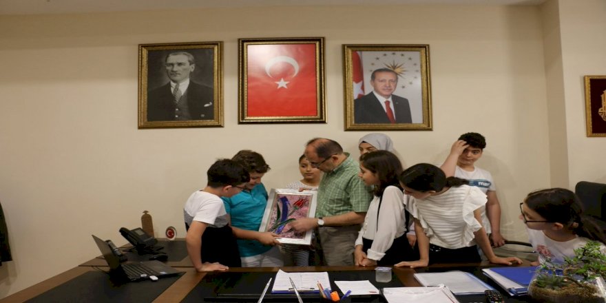 Daha sonra çocuklar belediyenin sanat atölyesinde yapmış oldukları tabloyu İsmail Yavuz’a hediye etti.