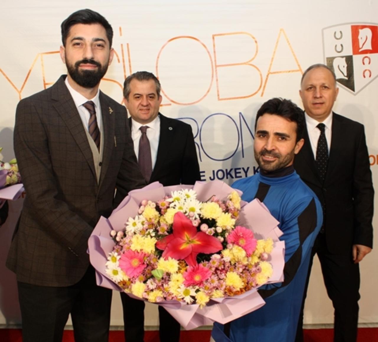 Çukurova Üniversitesi Rektör Başdanışmanı Doç. Dr. Metin Özkan, kazanan atın jokeyi Ahmet Çelik’e çiçek takdim etti.
