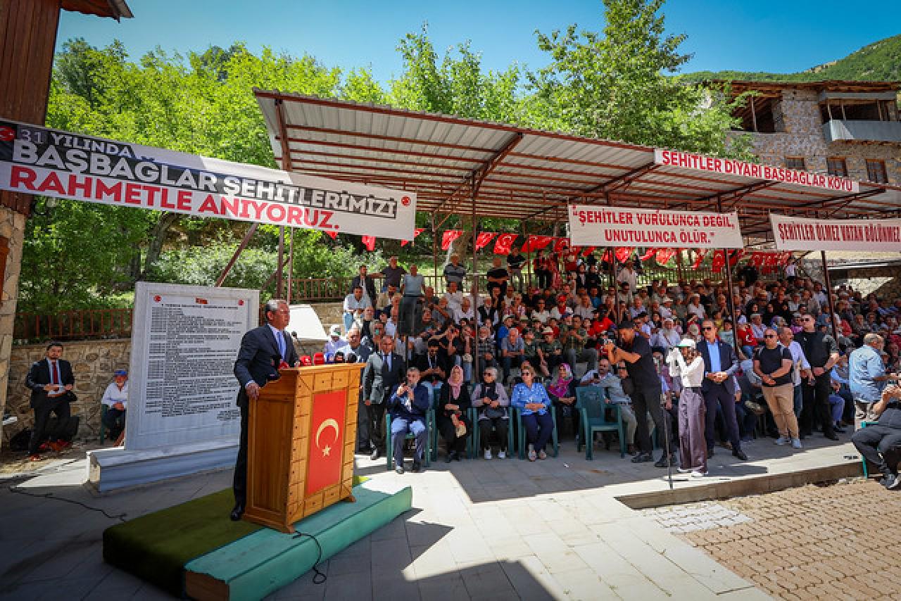 Cumhuriyet Halk Partisi Genel Başkanı Özgür Özel, Erzincan’dan Başbağlar katliamının 31’inci yıldönümü anmasına katıldı. Özel burada yaptığı konuşmada, “Hesap bu ülkede mezhep kavgası çıkarmak. Terör örgütü ki hepimizin birliği ve beraberliğine kastetmiş. O terör örgütü ya da o terör örgütünü kullanan başka güçler ‘mezhep savaşı çıkarır mıyız’ diye niyetlendiler. Bu büyük acıya rağmen iki tarafın da acılarını yüreklerine gömen ve birbirlerini seven, vatanını seven insanları bütün dünyaya bir büyük insanlık dramından, nasıl bir insanca mesaj, nasıl bir kardeşlik, birlik ve beraberlik çıkarılır, onu gösterdiler. O gün o acılarında, bu mezhep kavgasına yönelmeyenlerin verdiği mesajı bugün bir kez de buradan ben ifade etmek isterim ki Türkiye Cumhuriyeti’nde Aleviler ve Sünniler kardeştir. Türkler ile Kürtler kardeştir. Buna kast edenler de kalleştir” ifadesini kullandı.