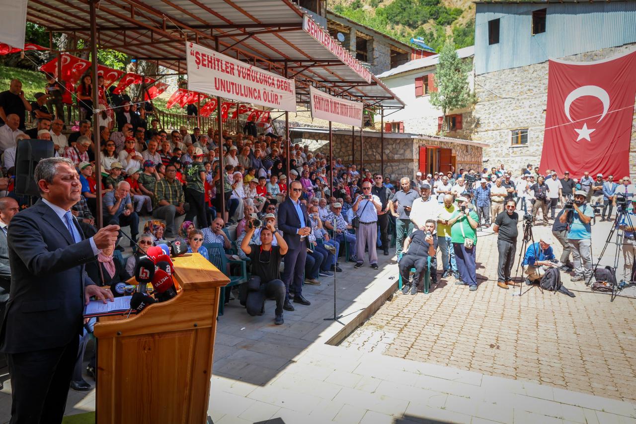 Erzincan’dan Başbağlar katliamının 31’inci yıl dönümü anmasında konuşan Cumhuriyet Halk Partisi Genel Başkanı Özgür Özel, “31 yıl önce yüreklerinde katlanılmaz bir acı hisseden, bir büyük acıyı burada yaşayan Bağbağlar köyünün yüreği yanık, kalbinde vatan, millet ve bayrak sevgisi olan güzel insanları. Hepinizi saygı ile selamlıyorum. Hepiniz hoş geldiniz. Aslında biraz önceki konuşmalarda birliğin ve beraberliğin önemi, ülkenin ortak menfaatlerinde bir arada olmak, tasa ve kıvançta ortaklaşabilmenin önemini ifade eden çok önemli konuşmalar oldu. Devletin ve milletin birliği ve bütünlüğüne vurgu yapan önemli konuşmalar oldu. O sırada ben bu konuyu hiç kelimeler kullanmadan ifade eden bir olaya tanık oldum. Bir Sayın Sevgili gazimiz, ev sahibi olmanın verdiği heyecan ile geldi ve protokole çay dağıtıyordu. Sayın Valim ayağa kalktı ve zorla elinden aldı. Götürdü dedi ki ‘Gazi çay dağıtır mı hiç?’. Gazi bu milletin devletine duyduğu sevgiyi ifade ediyordu. Sayın Vali de bu devletin devlet adamlarının milletine ve gazilerine, şehitlerine, onların ailelerine gösterilmesi gereken saygıyı, devletin kibir değil alçak gönüllük olduğunu gösteriyordu. İkisine de yürekten teşekkür ederiz” dedi. Özel şöyle devam etti: