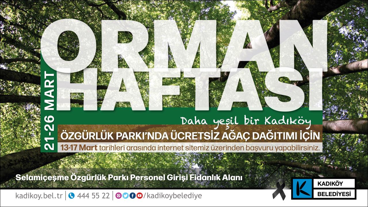 Kadıköy Belediyesi Park ve Bahçeler Müdürlüğünün 21 – 26 Mart Orman Haftası kapsamında "Daha yeşil bir Kadıköy için" sloganıyla hayata geçirdiği projeyle, Kadıköy'de bulunan apartmanların bahçelerine dikilmek üzere ücretsiz ağaç dağıtımı yapılacak.