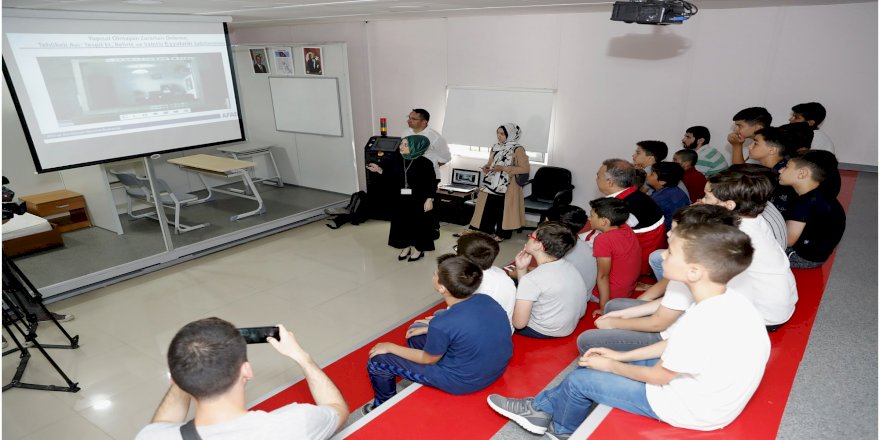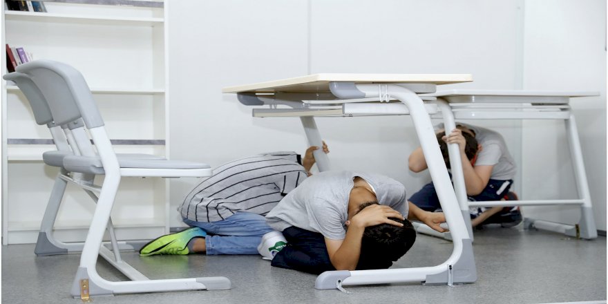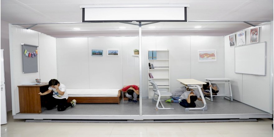 Deprem sırasında yapılması gerekenler eğitimciler tarafından anlatıldıktan sonra, 7.4 büyüklüğündeki bir depreme göre ayarlanan simülatörde, sınıfta veya evde depreme yakalananların, yapması gerekenler uygulamalı olarak gösteriliyor.